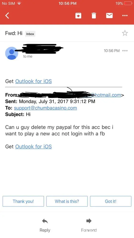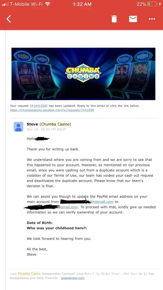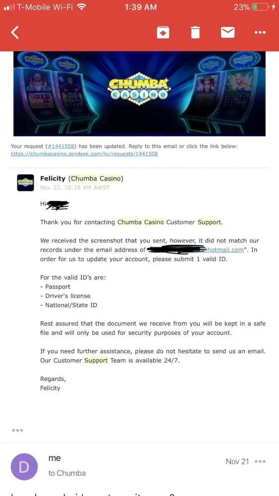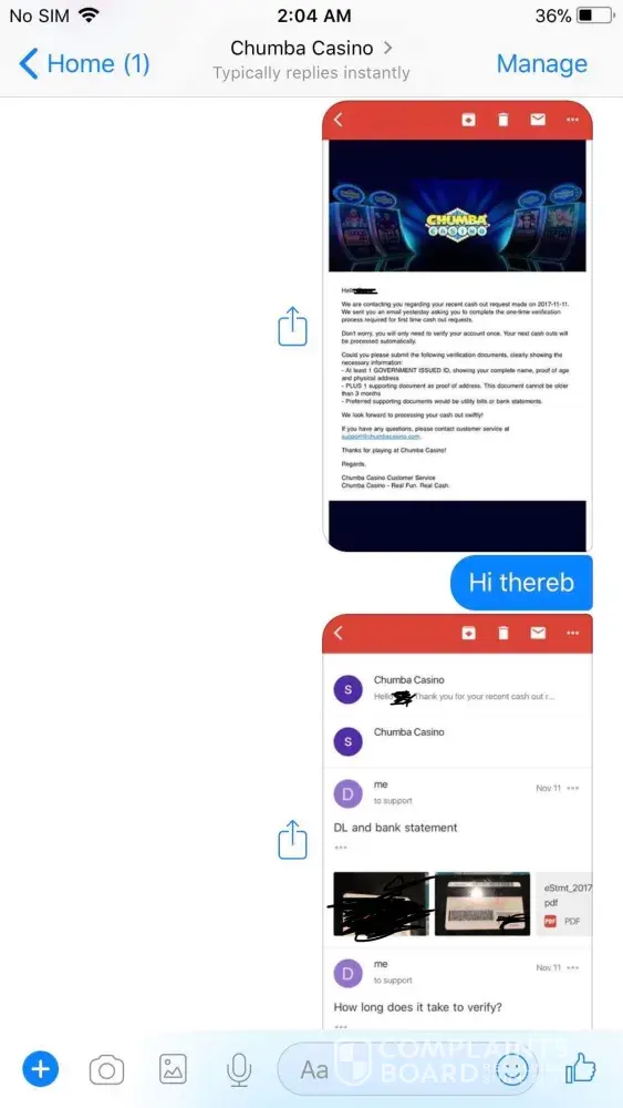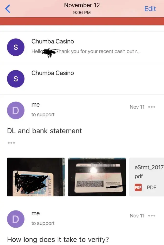 Chumba casino asked for my information, and I complied. A few days went by with no feed back from chumba casino. So I began emailing them with no response. I made all my deposits threw paypal. So I went to paypal and asked for a back pay or stop pay to chumba casino's. I did this with every deposit I made. I instantly got a email from chumba. They finely...