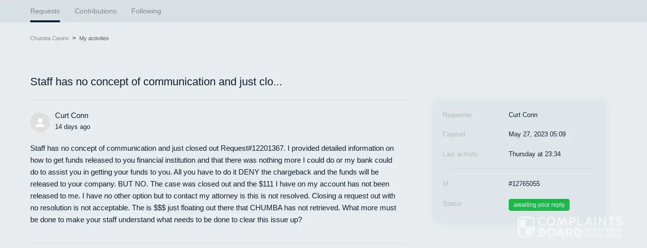 I have filed 3 request to resolve issue with my Chumba Account and each have been closed out. Each this Nolan has kept requesting the same information can not be provided. I have provided all my banking contact information, case number and representative contact name he keeps asking for something that can not be provided and he will not listen to what needs to be done to resolve this. The have blocked my account and have $111 of my money. They have also blocked me now on Facebook. I need help in resolving this but can get it resolved and it keeps getting assigned to a Nolan and he even responded to a complaint I filed against help. Now the request shows waiting my response but they have blocked me from the ability to respond.