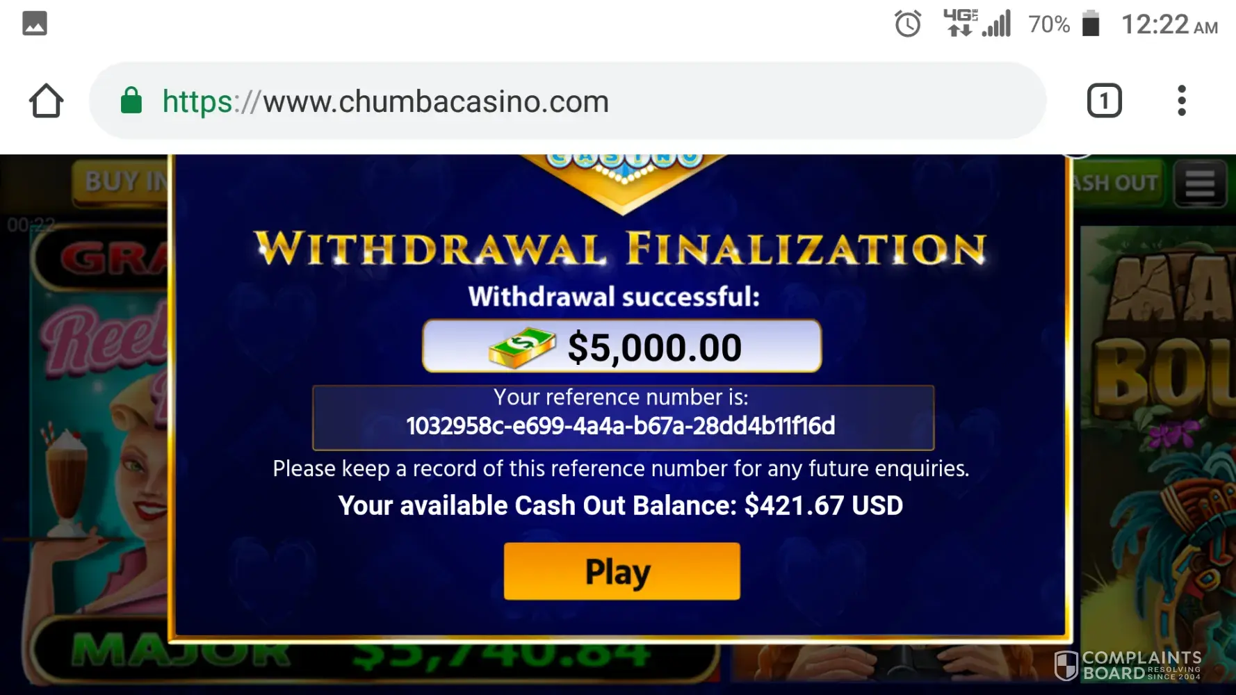 I cooperated in every way asked with the customer service manager Ivan after 30 days I filed a grievance with the Better Business Bureau and the malta Gaming Commission. just as I had said I would Ivan placated me lied to me cajoled me did everything he could to make sure that I did not get paid the monies owed to me by chumba Casino