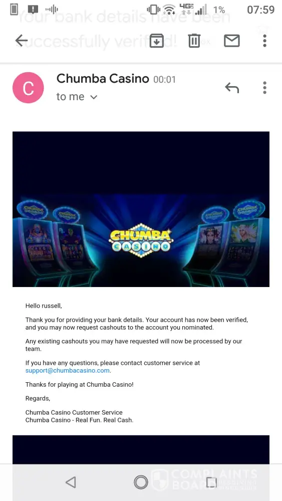 Jan 13, 2019 I cashed out 4500.00 . It took a long time to finally get them all of the info that they requested because no matter what was submitted they always had some excuse to not verify me . Finally they sent me emails saying my bank had been verified and my withdrawls had been processed . Days later when I asked where my money was they said my bank declined the transaction, but I went to my bank and met with the accounts manager and there were no declined transactions on my account . I have sent hundreds of correspondence regarding this matter, including 3 complaints to The Malta Gaming Authority, 1 to Chumba's corporate office, and now this one to you . Malta did answer and said that Chumba provided them with a screen shot of a declined transaction, but I find that hard to believe because my bank says it did not happen . So, Malta advised me to work with Chumba to resolve this . I have now been waiting for my money for over 3 months, and I want what I won, I want the 4500.00 that they owe me . I have been opening tickets almost daily on their customer service site asking for some customer service, however they do not answer . Right now I have 13 unanswered tickets asking for help, and it has been 13 days since the last time they answered any message . Please look into this casino ... they are stealing peoples money and promising to pay when people win, but they clearly have a lot of people that they have scammed . Someone needs to either make them a legitimate casino or shut them down