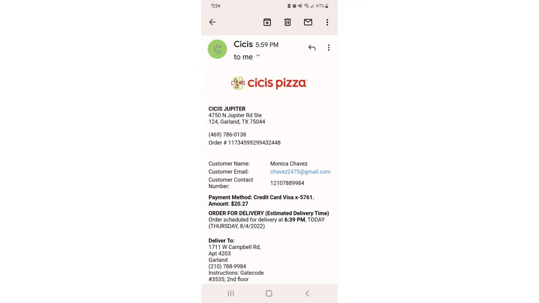 I ordered delivery online as I always do. I received a message that there was a problem with my order and stated that I needed to contact the store location on Atlanta Hwy, Athens GA. I called and was told I did not have an order and that I should not have a charge on my card. I hung up and checked my credit card and sure enough i had a charge from Cici'...