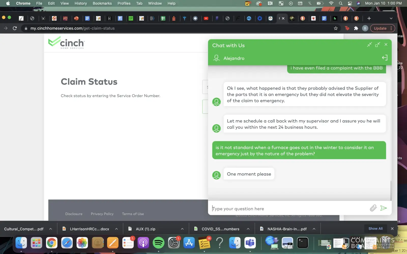 Cinch home warranty came with new house. Furnace broke, and I contacted the company on 12/20/21. They sent out a repair tech. Tech needed a capacitor and said Cinch had to order the part, and once it was shipped to him, he would be back to repair furnace. I was told part would be shipped within 2 to 5 days depending on holiday/covid delays. On 1/3/21 I contacted the company and was told the part had not shipped but my case was being "escalated". Day after day I contacted the company, finding that the company was still trying to locate the part. On 1/10/21, the customer service agent told me that the part had been located and was due to arrive on 1/17/21. I told agent that it was so cold in the house we had to turn off all the water to keep the pipes from freezing and could the part be shipped faster. Agent said he would escalate the case but the part had been shipped and it was not shipped as a rush shipment so it would not arrive any faster. I told him that the case had already been escalated. Direct quote-"oh my god, so sorry, apparently they did not do it for some reason." I asked why a broken furnace in the winter is not automatically an emergency and was told it had to be 40 degrees F or below for it to be an emergency. I asked if there was someone that monitors the weather and the claims and was told no. When making the claim the agent checks the temperature.
