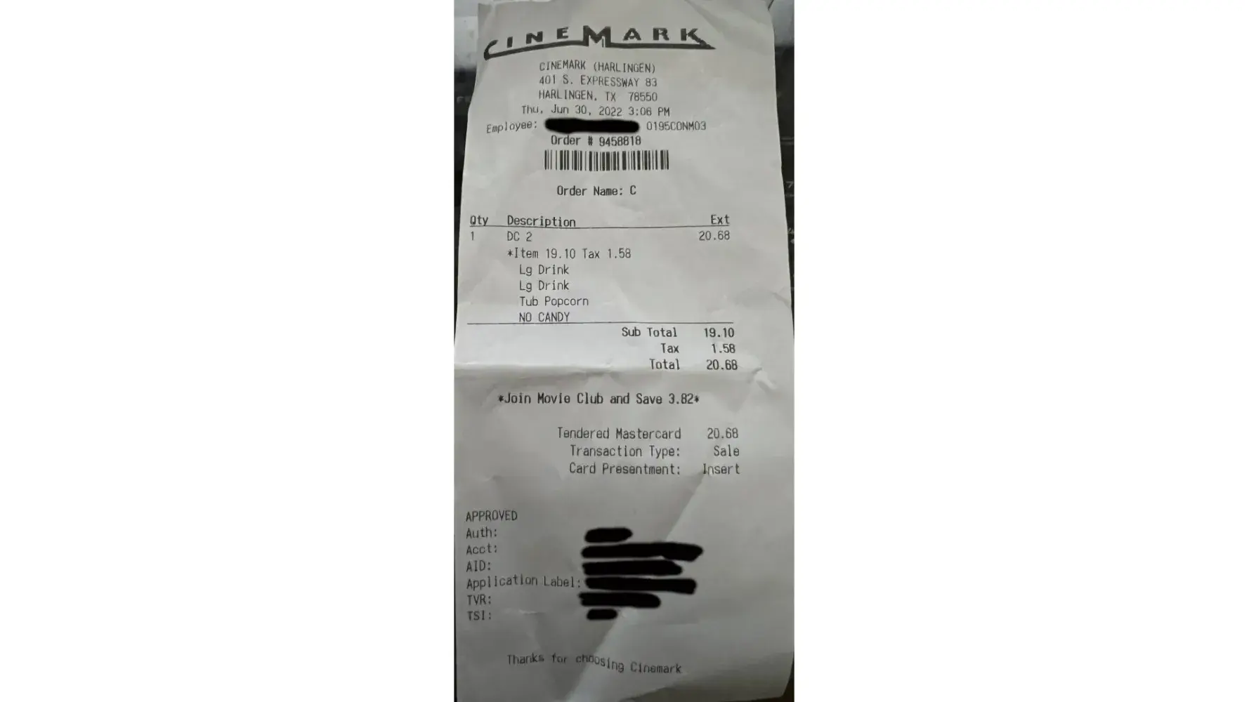 We continued trying to eat our popcorn even though it was all crumbs until eventually my sister had enough because it was annoying to eat it, so I took the remainder of the bucket which was still about 1/3 to 1/4 of the way filled with the crumpled up popcorn. I went to the front of the Lobby to ask if they still did refills and this old lady walks up from behind the counter, I didn't catch her name but she had a different greyish shirt uniform (With black stripes I think) compared to the other workers who all had black shirt uniforms, without giving me a chance to say anything she simply says they no longer did refills, I said okay but all of my popcorn was crumpled up and showed her the tub with all the crumbs of popcorn in it. She then rudely gives me a look and sarcastically said, "Well then, you shouldn't of had arrived late to the movie then huh?" she said this very rudely in an attempt to blow me off, so I simply said okay and left back to the theater with my tub of crumbs. I was never rude, mean, or pushy with this person I was very respectful even after she did this, so getting told off like felt very uncalled for, she could've just said that there's nothing she could've done about this and I would've been okay with that, but instead she chose to mock me and be disrespectful, I wasn't even late to the movie, I arrived, took my sister to the theater room first because she was excited, I then went back and waited in line to get my Large tub of Popcorn (half of it being crumbs) and two sodas, came back to the theater and still watched 15 mins of commercials before my movie even started. Being disrespected this badly after paying $20.68 for a tub of popcorn that was basically all crumbs is the most negative experience I've ever had from this movie theater. I've blacked out some of the info on the receipt due to the website saying to block out personal info of me and others.