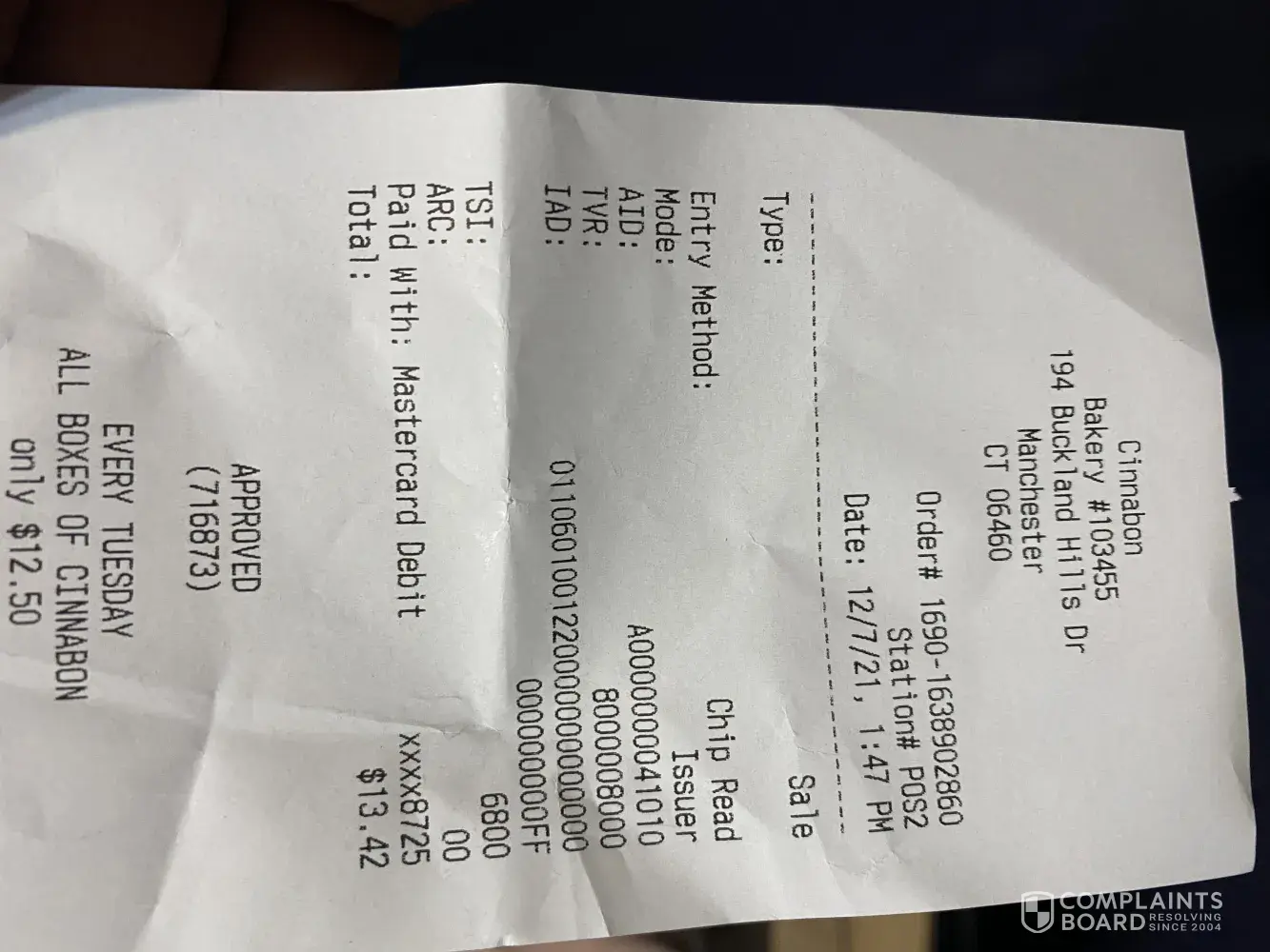 I purchased a box of Cinnabon from your store in the Manchester mall and they were hard and not completely baked, my 2 daughters, wife and sister said the same thing, hard not completely baked. The cost was 12.50 per box, disappointing and unsatisfactory, this was my first time visiting and my first purchase and I don't know your policy is but I would hope that you want to maintain a policy of professionalism and good quality to your customers