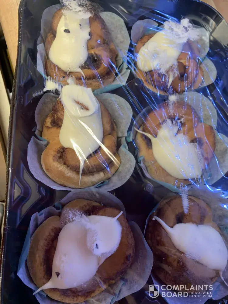 I purchased 2 boxes of them from my local Walmart for 9 something ( have the receipt )later that night took that box out of my freezer to defrost an eat to find black plastic pieces On top an around different Cinnabon's all inside under the plastic wrap that covers so the plastic was never opened so the only thing that got open was the box to take the tray out the pictures below will prove it shouldn't the packages be checked before boxed I'm very disappointed in this matter only because they really aren't that cheap to begin with then to have this happen so if someone could email back about this matter