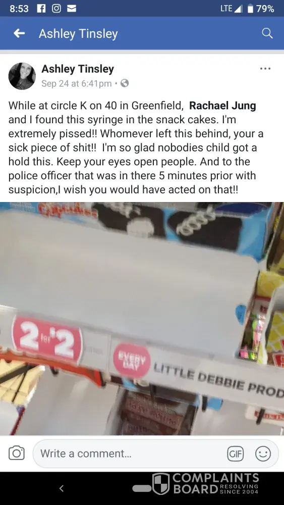 Roughly Sept 24th 2018 there was a sharps object found in the Little Debbie products inside the store. Apparently there had been any officer in there due to suspicious activity of someone. The picture of the incident has been posted on Facebook. I visit this store multiple times in week. Please tell me something has been done about this and the items have been removed and replaced.