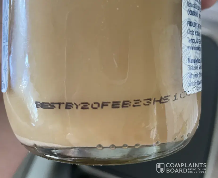Today I was in a circle K at around 12:45pm (April 9th, 2023) and bought 2 drinks (coffee drink and gatorade) and gas. There were no iced cups for iced coffee so I grabbed a Circle K Brand bottled frappuccino. When I got home I realized that there was mold/ milk slime growing on the inside of the bottle. I checked the expiration date and it was February 20th, 2023.