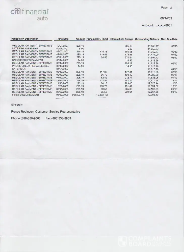 i was late maybe 4 or 5 times throughout my 5 year loan, also paid a convenient fee of $14.95 per month by paying my loan over the phone. now i am told i have $1, 800.00 balance in fees, how on earth is this possible. they sent me my payment history and i still cannot figure out how i owe this money. i explained to them that i should the better business bureau because what they are doing is illegal, without any hesitation he told me to do what i felt i had to do and if i do not pay this balance i will have my vehicle reposessed. now they wanted me to take out another loan to finance this $1, 800.00 i now owe. why would anyone want to finance something they already paid for. i took and gave them $200 or more a month, what i could afford, still listening to the phone ring every month explaining to me that i am late on my payment. what payment my loan is expired and now i owe a payment. and paid them in full by october of 2009, it is now march, 2010 and i still have no title. once again, pick up the phone and try to get an answer. of course they explain they mailed it to me in november but i can call another 800 number to order another one, another one, here we go again. they of course give me another number to contace and guess what i can have a title printed off my computer which is not a real title, or i can pay some more money to citi financial auto to get an official title.