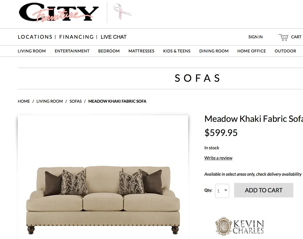 I purchased two Kevin Charles sofas in March, 2015. The first week a zipper broke when I was trying to reposition the slipping cushion. They did send a new cover. Now the cushions have to be slid back in every time you sit on them. The fabric is wearing and pilling and I am getting no where with Kevin Charles or City Furniture. I want a full refund.