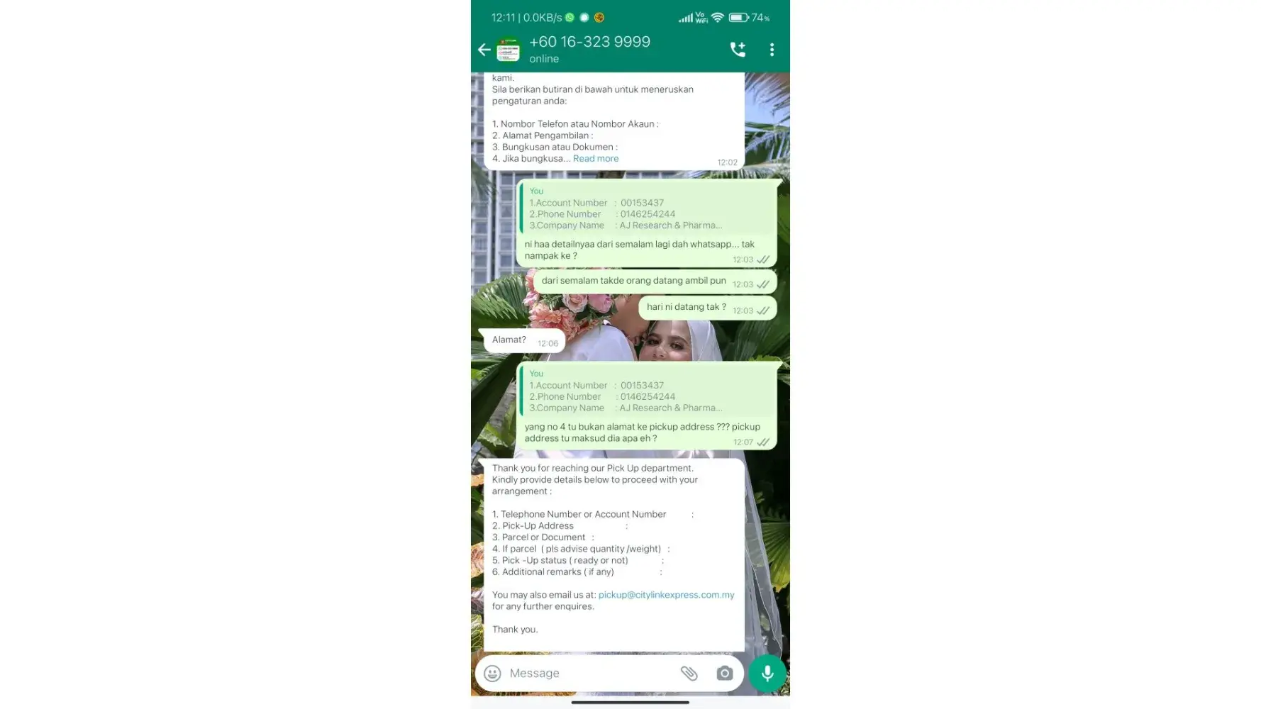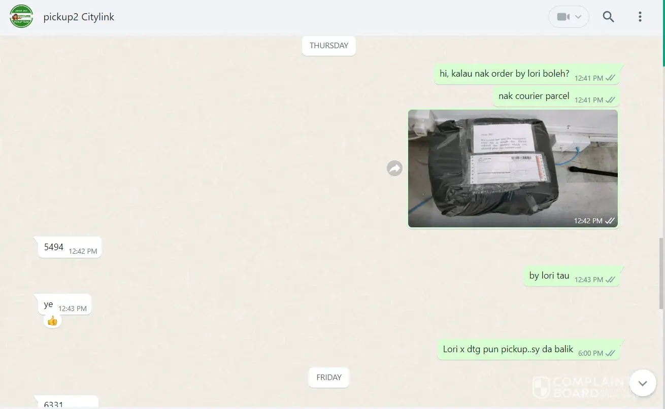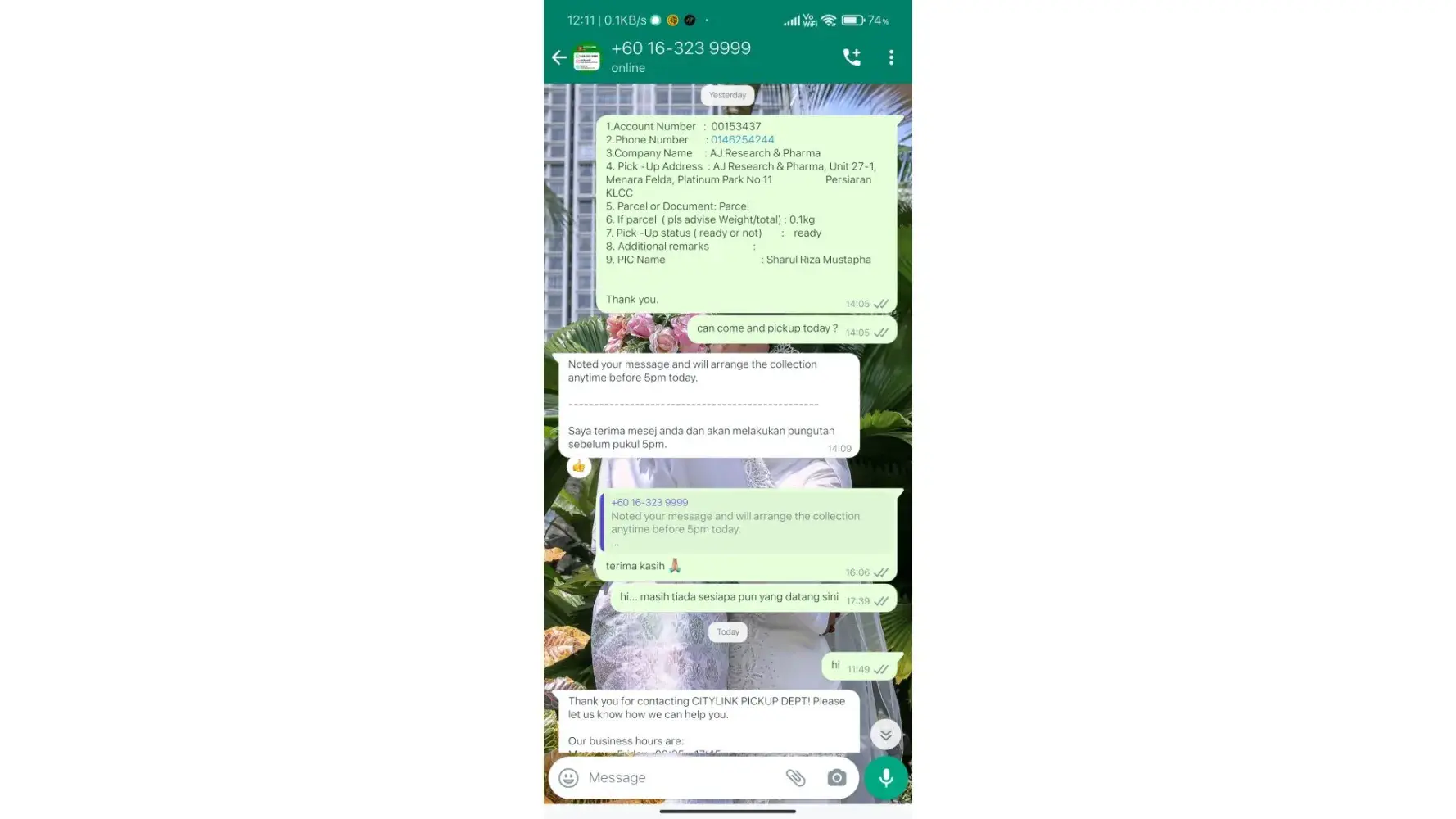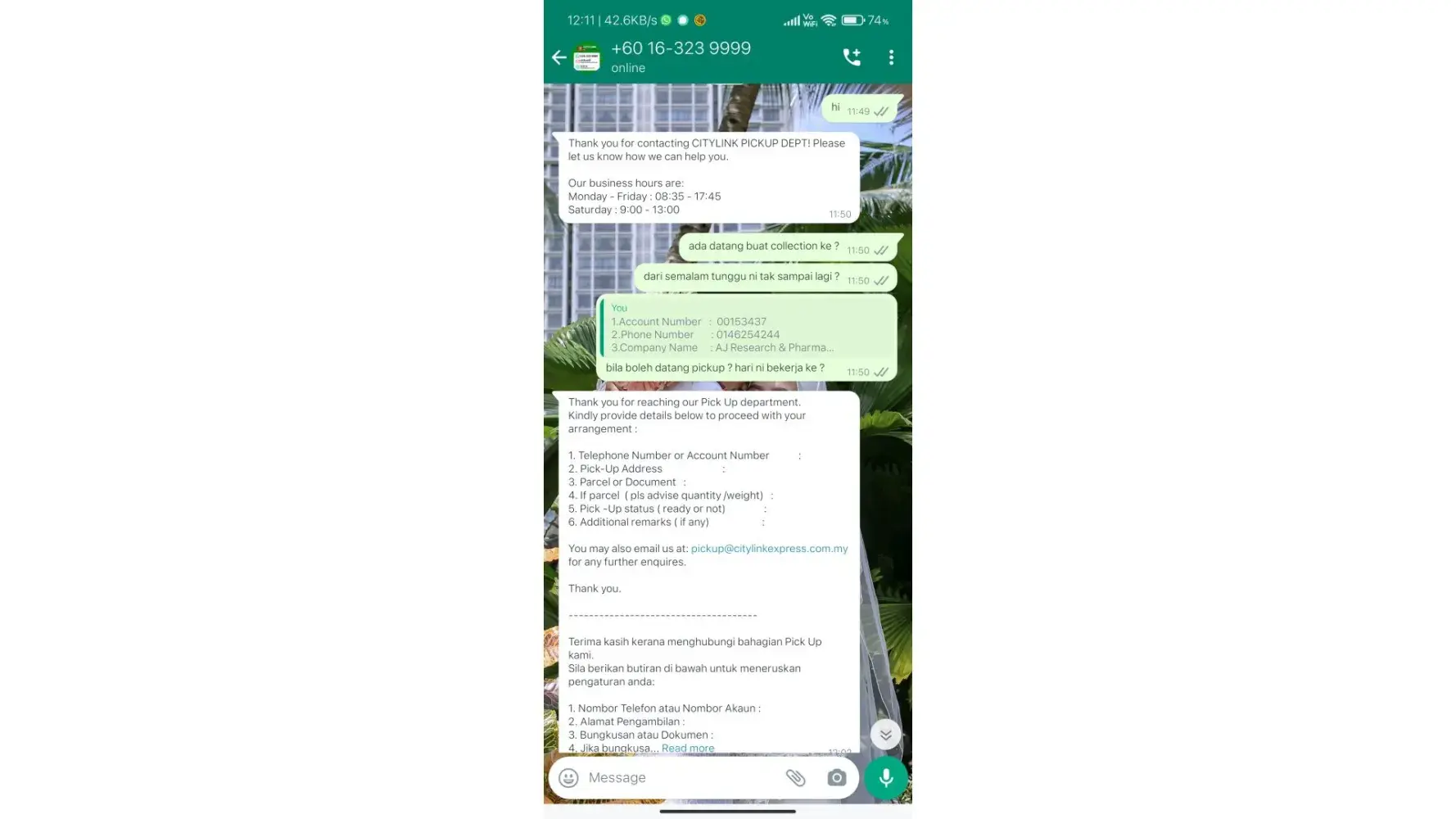 On 20-Feb-2024 at 9.49am, I sent Whatsapp messages to Citylink Melaka [protected]) providing my account number and address, seeking their help to come and collect my parcel. The person in charge acknowledged the receipt of my messages.