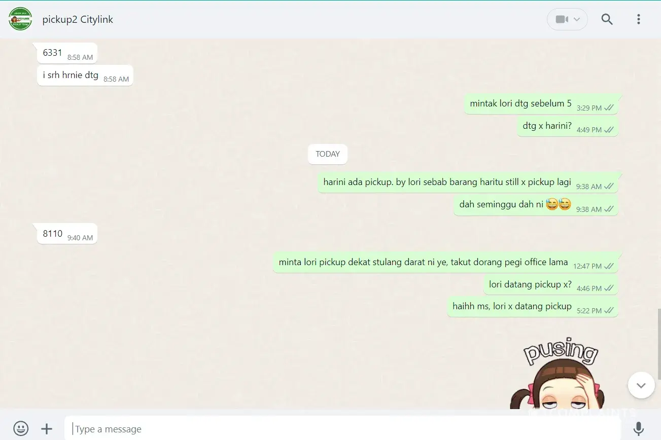 Hi, I want to complain your City Link near Johor Jaya branch. I keep sending them whatsapp to pickup the parcel and documents, however until a week they didnt come for pickup. I feel disappoint and quit angry with their irresponsible towards work.