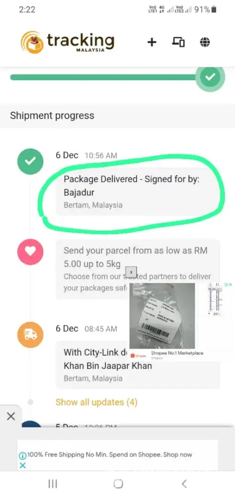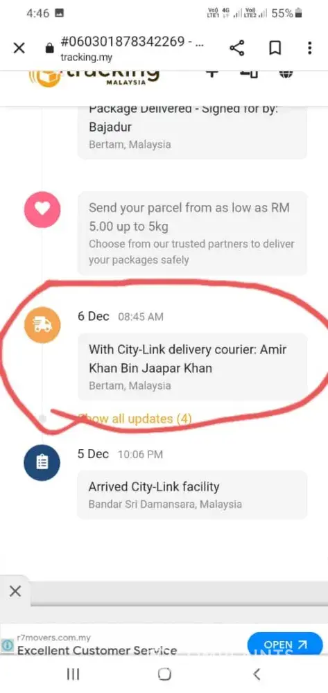 5 dec - 10.06am.. Package send to I city link facility (bandar seri damansara)