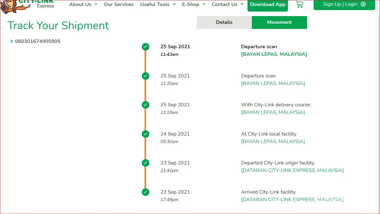 It is local Shipment ship to local area. unfortunately my client report yet received. I have email to city-link they replied will check but after more than 10days no respond from city-link even those i have follow up email with city-link everyday.
