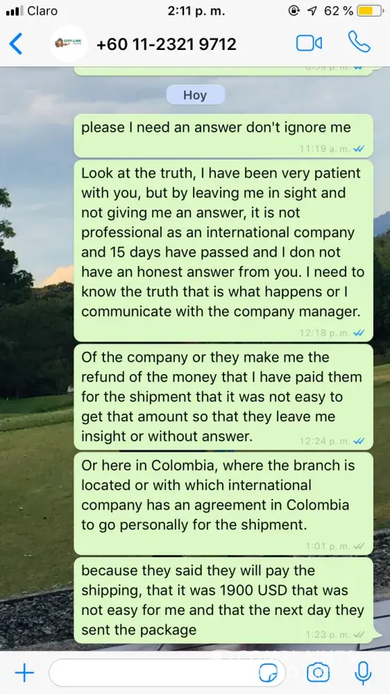 Good morning, I have communicated with you through WhatsApp, wanting an honest and professional response from you, but the only thing I receive from you is to let me see and without any unprofessional response from an international shipping company, 15 days ago. He made a payment of 1900 usd to make me deliver a shipment that was made to me through you and the last response I got was that it probably arrived 8 days ago and your shipment will be delivered soon.