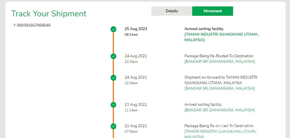 (Meanwhile I had also make another shipment (2nd) on July 5th 2021 to Sungai Petani for different location, and it was delivered on July 8 2021.)