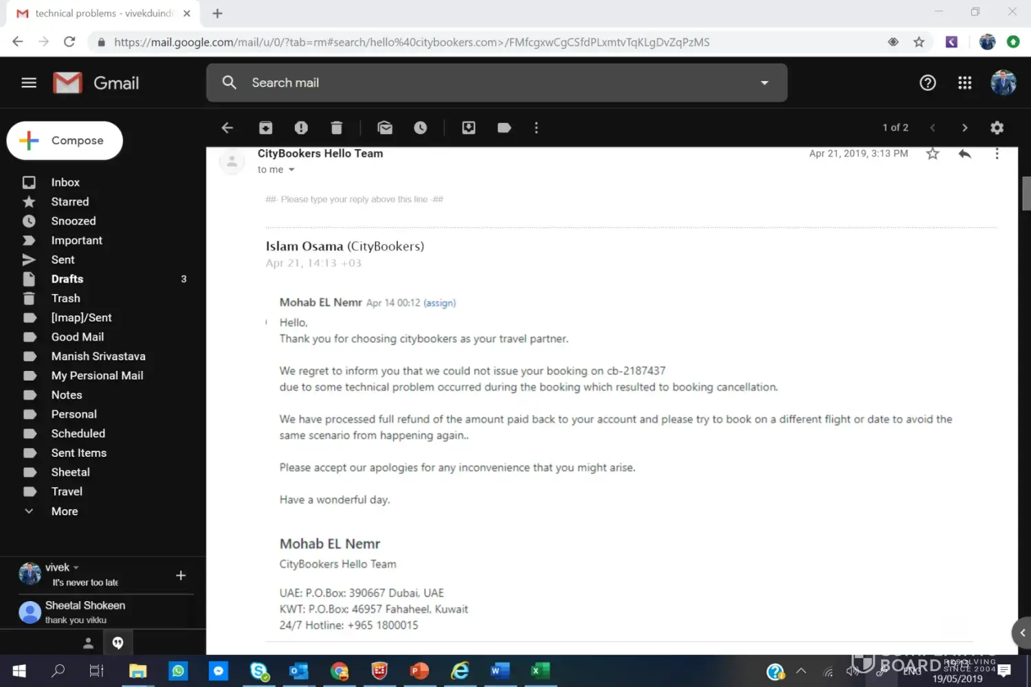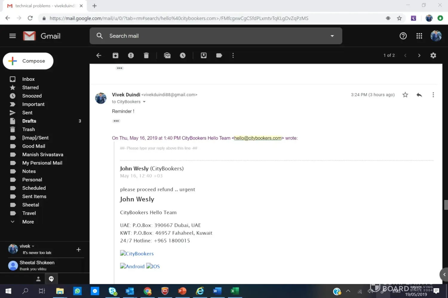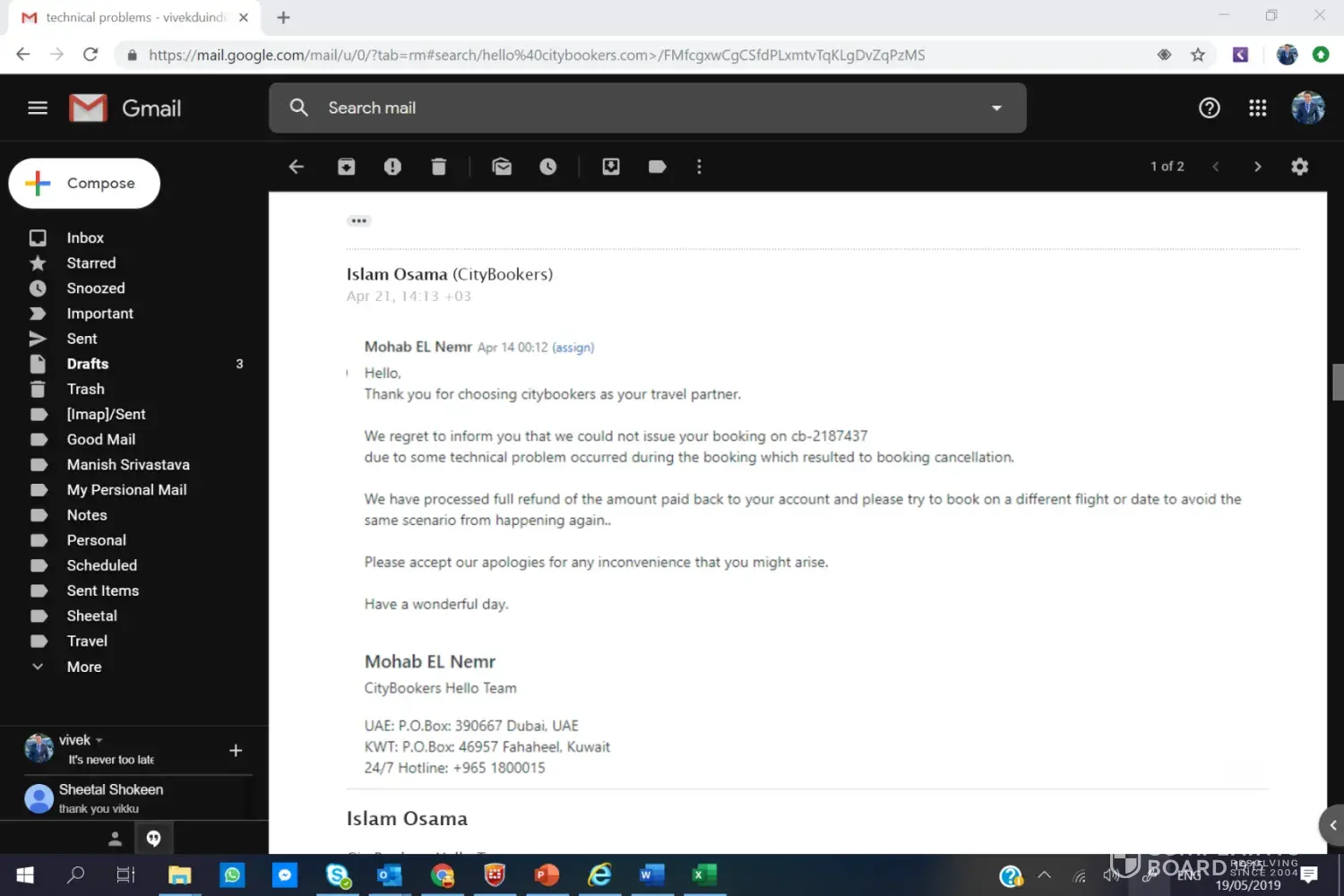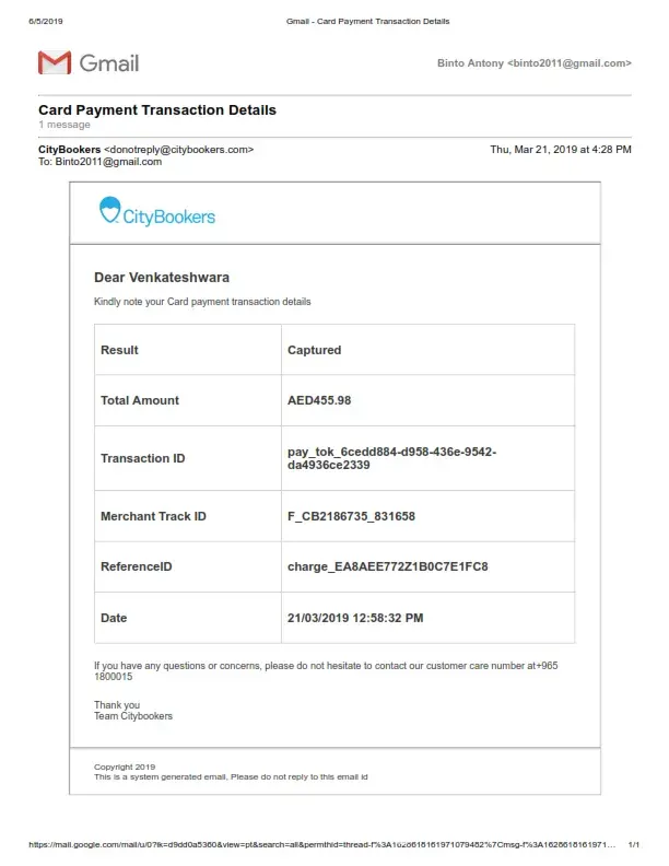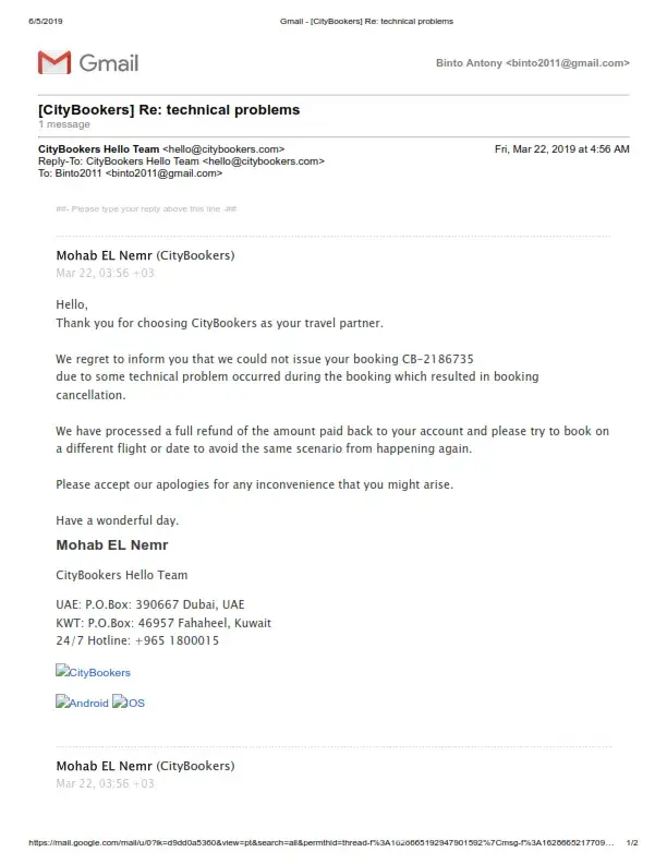 I booked one of my company labour air ticket from Dubai to Hyderbad from City Booker on 21st Mar 2019 (Copy Attached) and I received Air Ticket also my mail. but next day 22nd Mar 2019 i received email from city bookers your ticket cancelled due to some technical reason (copy attached) and they will refund the payment asap.