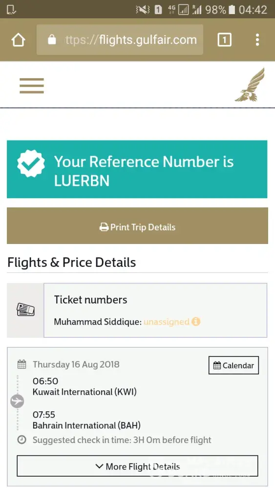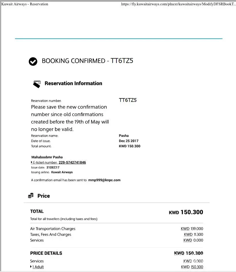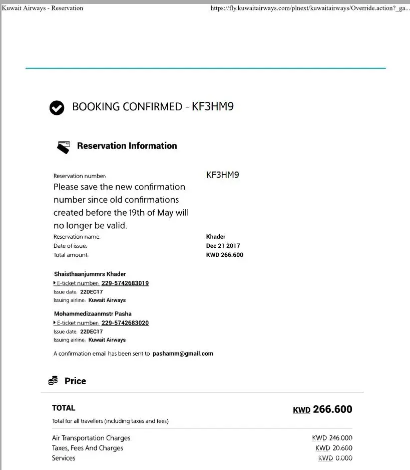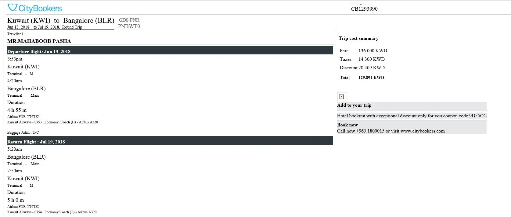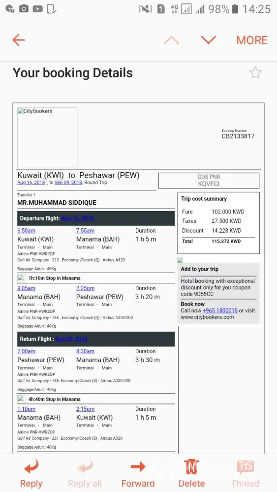 I booked return ticket from city bookers on 28 Jun, 2018 from kuwait to Peshawar dated 16/08/2018 and back dated 09/09/2018 with Gulf air in KWD=115.They give me booking No CB 2133817 with PNR No VWRZQP.