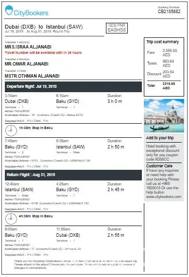 I'm Abdulmunam Jawad AlJanabi I booked tickets for my family on web site of Citybookers on 4th March 2019 on Azerbaijan Airline Booking Number CB2185882 (Dubai to Istanbul) two way Date 19th July 2019, I received an email from citybookers that the tickets will be refunded to your account because tickets had been cancelled I waited till the day of discovering that the tickets are Scam tickets from Azerbaijan airline main office in Dubai, so I need my money to be refund 900$