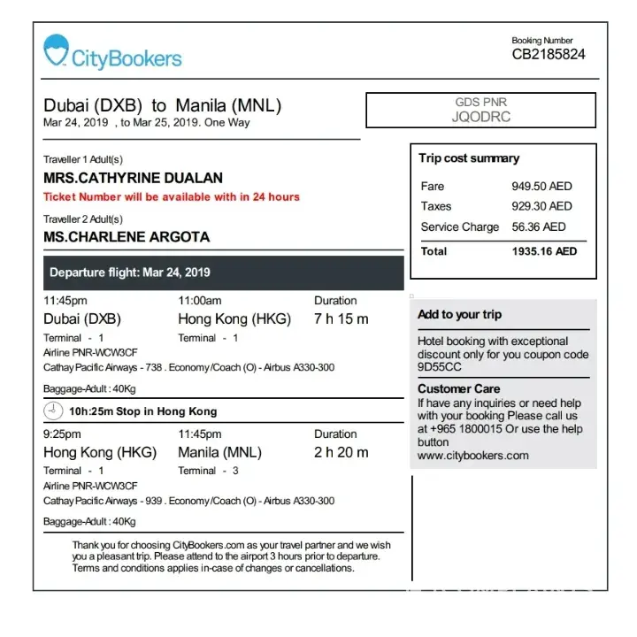 I booked my flight to the Philippines on November 7, 2017 using skyscanner and then the citybookers option appeared as the third party, their price is ok compared to others that's why I chose them. I received an email from them about the transaction approval and the amount was deducted on credit card. They sent me also the booking number.But then I was asking them about the reference number for my booking, all I get was an automated response from email and fb messenger. I was trying to call them also but it's very hard to contact them especially when you are outside of their country. I just want a good response from them but it's not happening.