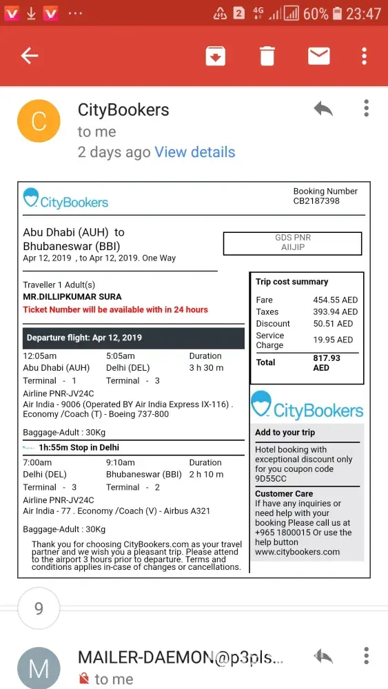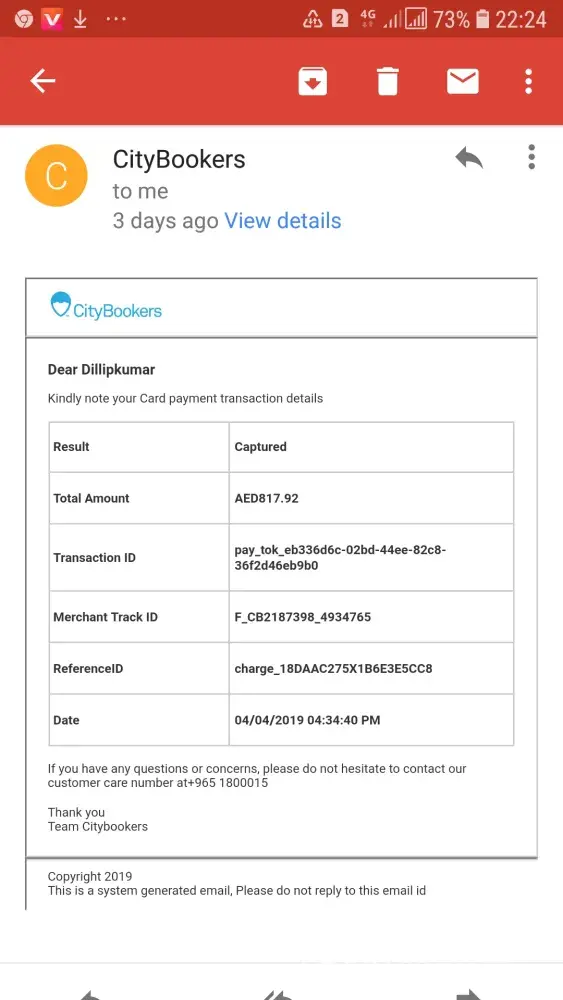 I booked 2 flights on November 3rd which came to a total of approx 6000 dirhams. The money was deducted from my credit card immediately however I have not received an e-mail with my flight details, confirmation number etc etc etc. I have e-mailed [protected]@citybookers.com 3 times and also messaged them on Facebook. I have not received any response.
