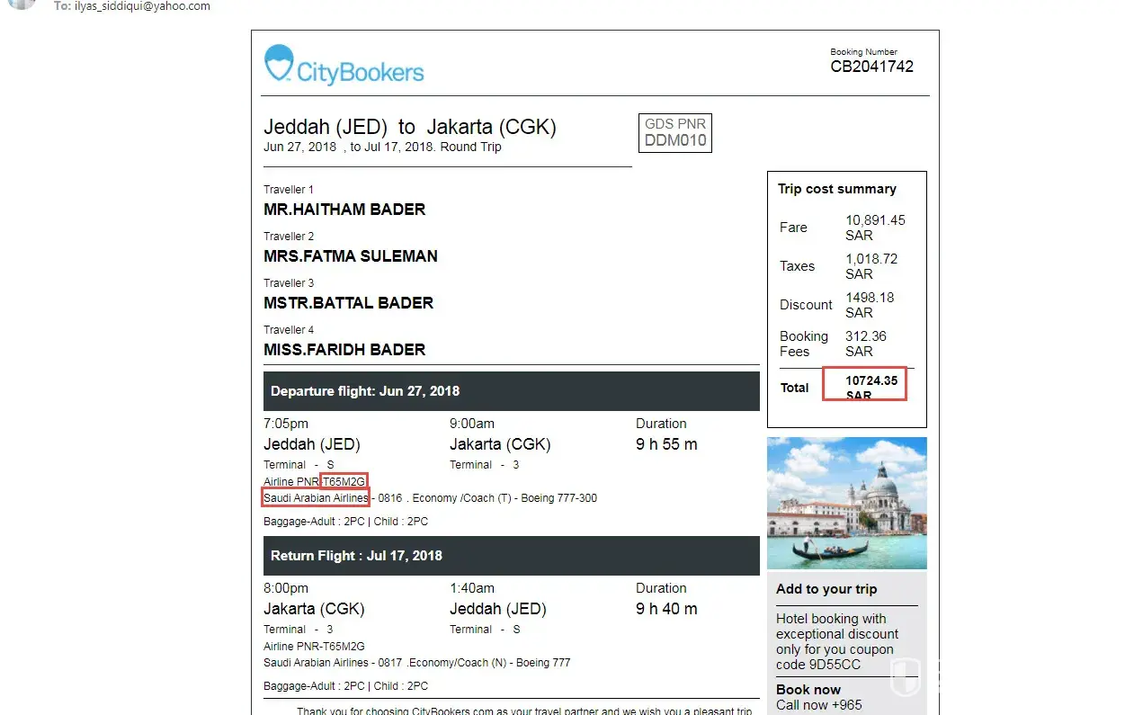I have booked a flight through city bookers website on Saudia, paid the full amount by visa and received a confirmation from city bookers on my email about flight booking and payment however on Saudia ticket isn't paid yet. Currently I'm at risk of losing my reservation! Because of city bookers...I have also sent email to customer service with no solution.