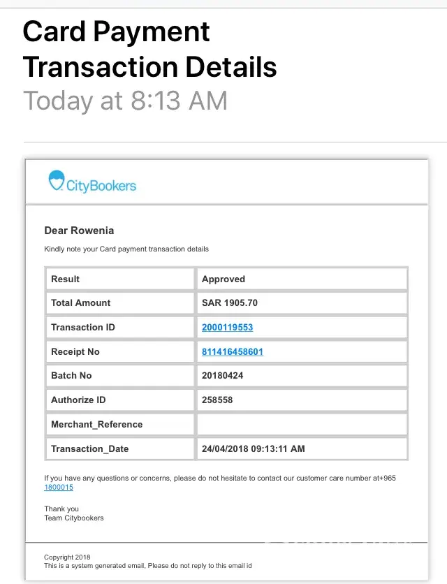 City bookers, I booked a ticket last 22nd of april from your site which cost of 3884.27 aed booking number cb 2000471 for 2 adults then when I check you debited 4017 aed in my card where its clearly shown the payment that I need to pay. Was only 3884.27 included all the taxes, im trying to call your number + [protected] but you are not picking up the calls I did also send you an email but theres no reply at all. Can you please be more active and reaponsible enough specially for the charges you shown. I need your asap response.