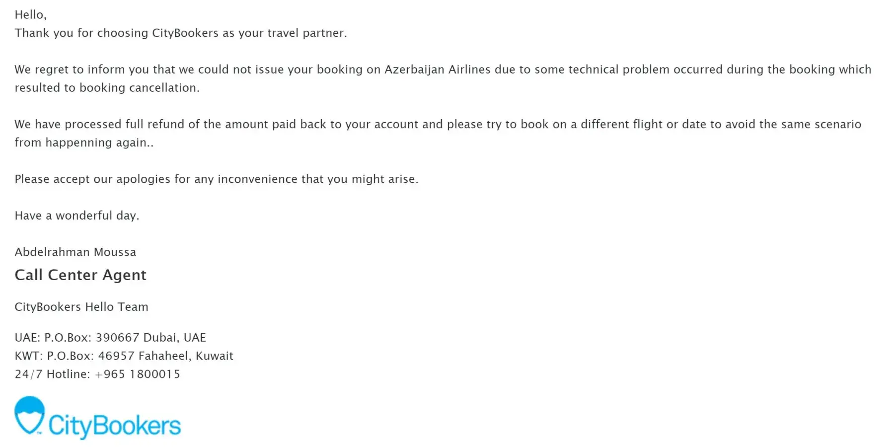 Thank you for contacting CityBookers customer service