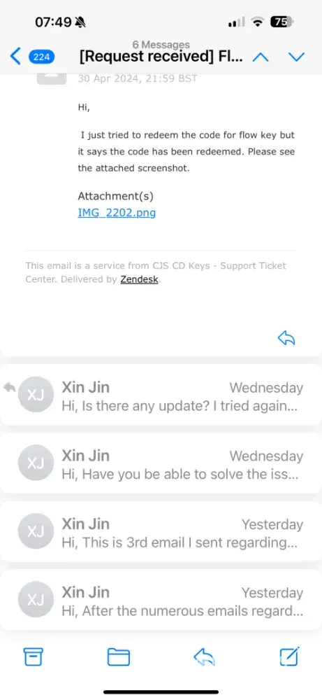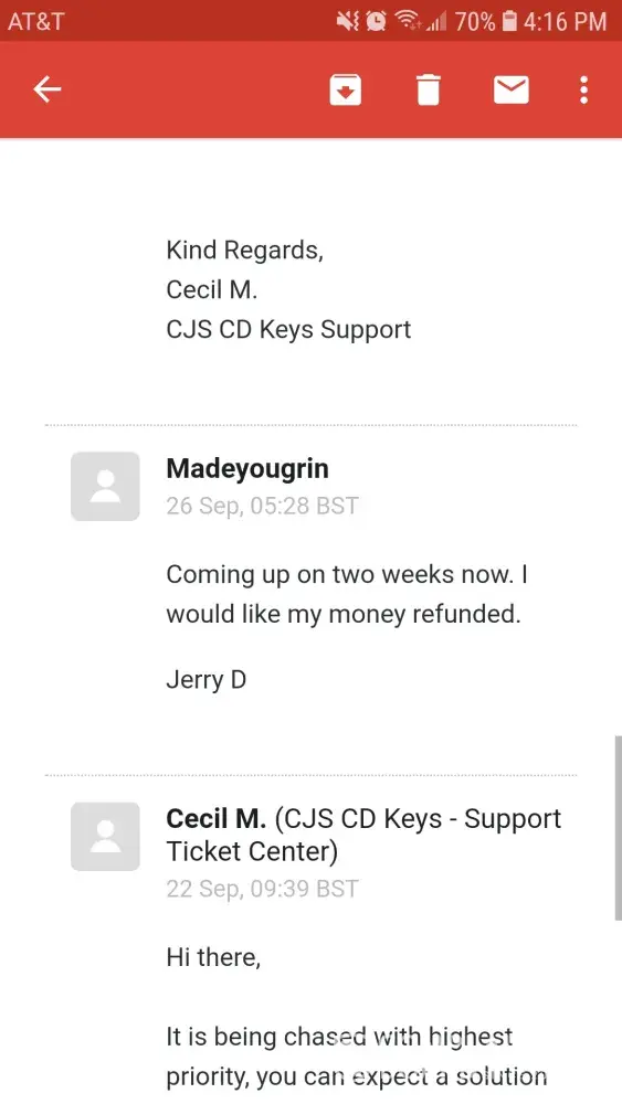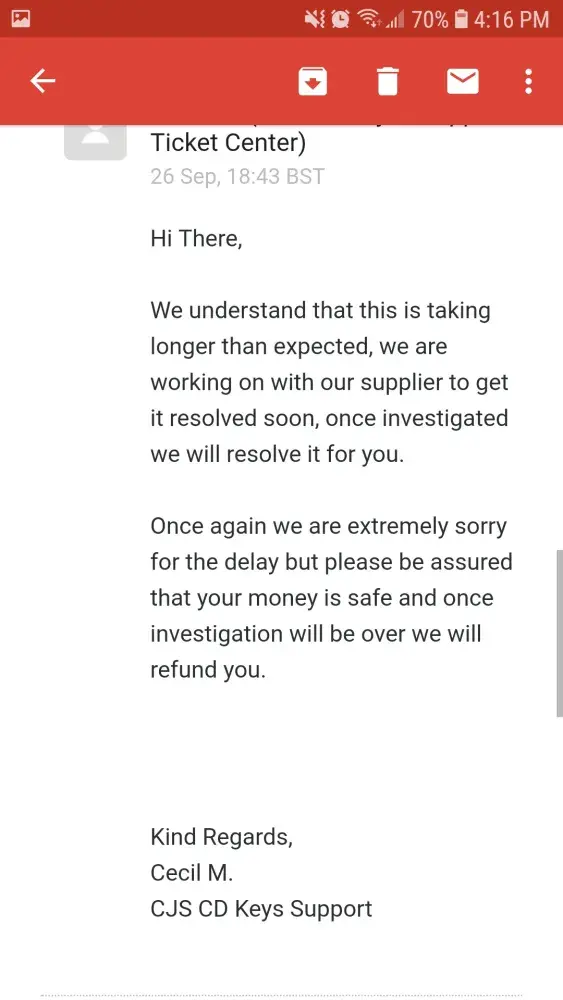 At October 5, i bought a fifa fc 24 key, and it did not arrive untill a day later. Problem was that when i finally received the key. It was faulty and already used. The staff told me this and they said they would give me a new one within 12 hours, its now been 2 days with no help.