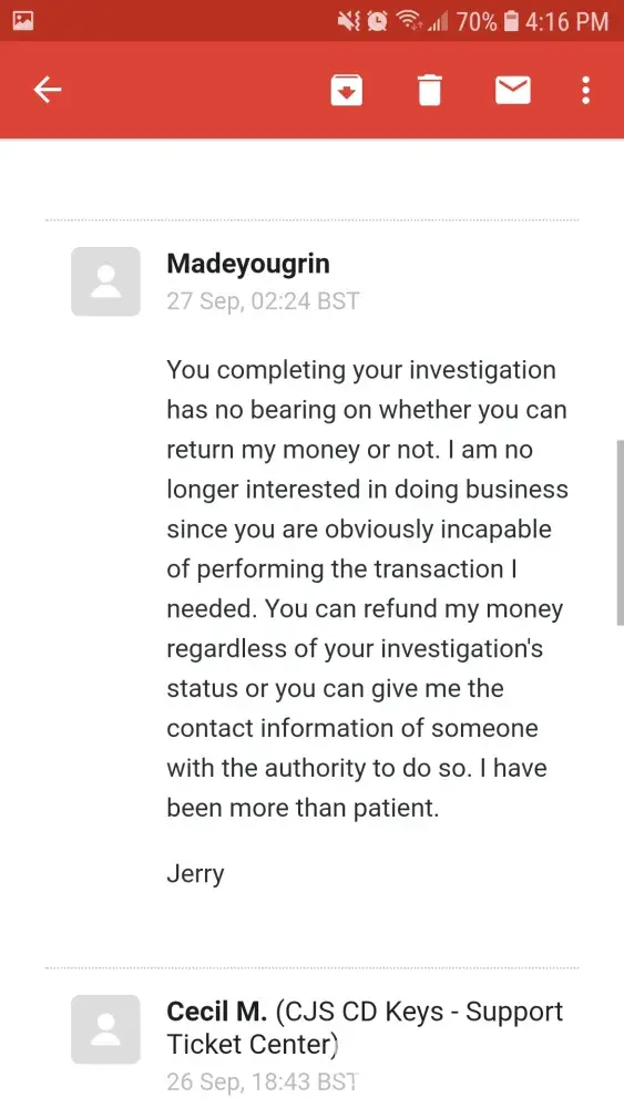 I bought a "Gears 5 CD Key For Steam" and they sent me a link to a shady page from another domain that asked me to enter my Steam credentials (!). Of course, I refused and asked their support to either send me the right product (the CD Key I bought), or to refund. They denied both. We went back and forth (I have the full conversation) and while they admitted that what they sent me was not what I bought, they STILL refused to refund me. I warned them, waited 3 days and started a PP dispute that's still ongoing. I'm yet to get a reply/resolution from them, it's like they're hiding their head in the sand and waiting for this to blow over. So I'll use that time to tell everyone to not fall for their bait and switch.
