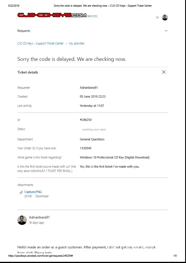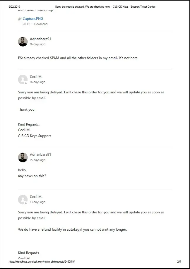 Fast forward to now, I thought maybe my first experience with CJS CD Keys was a fluke; surely a site with so many users can't be fraudulent, right? Well, wrong. With this purchase, upon buying, their new "Autokey" system has a very intrusive system that--once again does not let you know will be required--of sending them a copy of your Photo ID and a proof of residence like a utility bill. How ludicrous is that? Needless to say, when I said "Nevermind, give me a refund.", they told me there would be a "Convenience Charge" for doing so even though they never told me of that, or of this required information, before my purchase.
