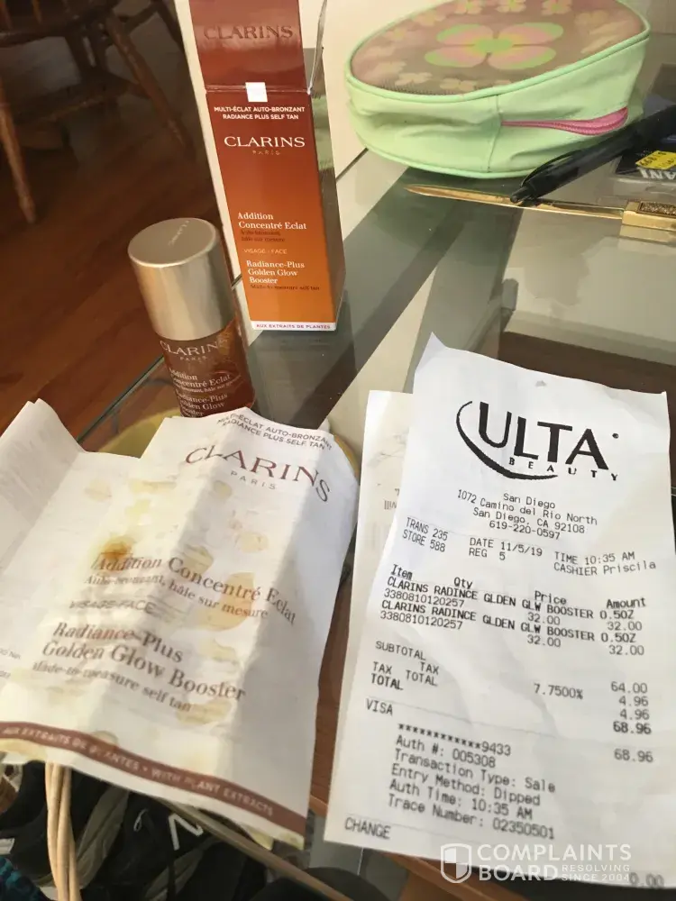 Today I purchased two (2) Radiance plus golden glow booster. I have vitiligo and need this product to 10 my white skin. There were only two on the shelf and I purchased both. One has leaked out and was sticky. So I see that half the Booster product Is missing. Please reimburse $32 the cost of one bottle.