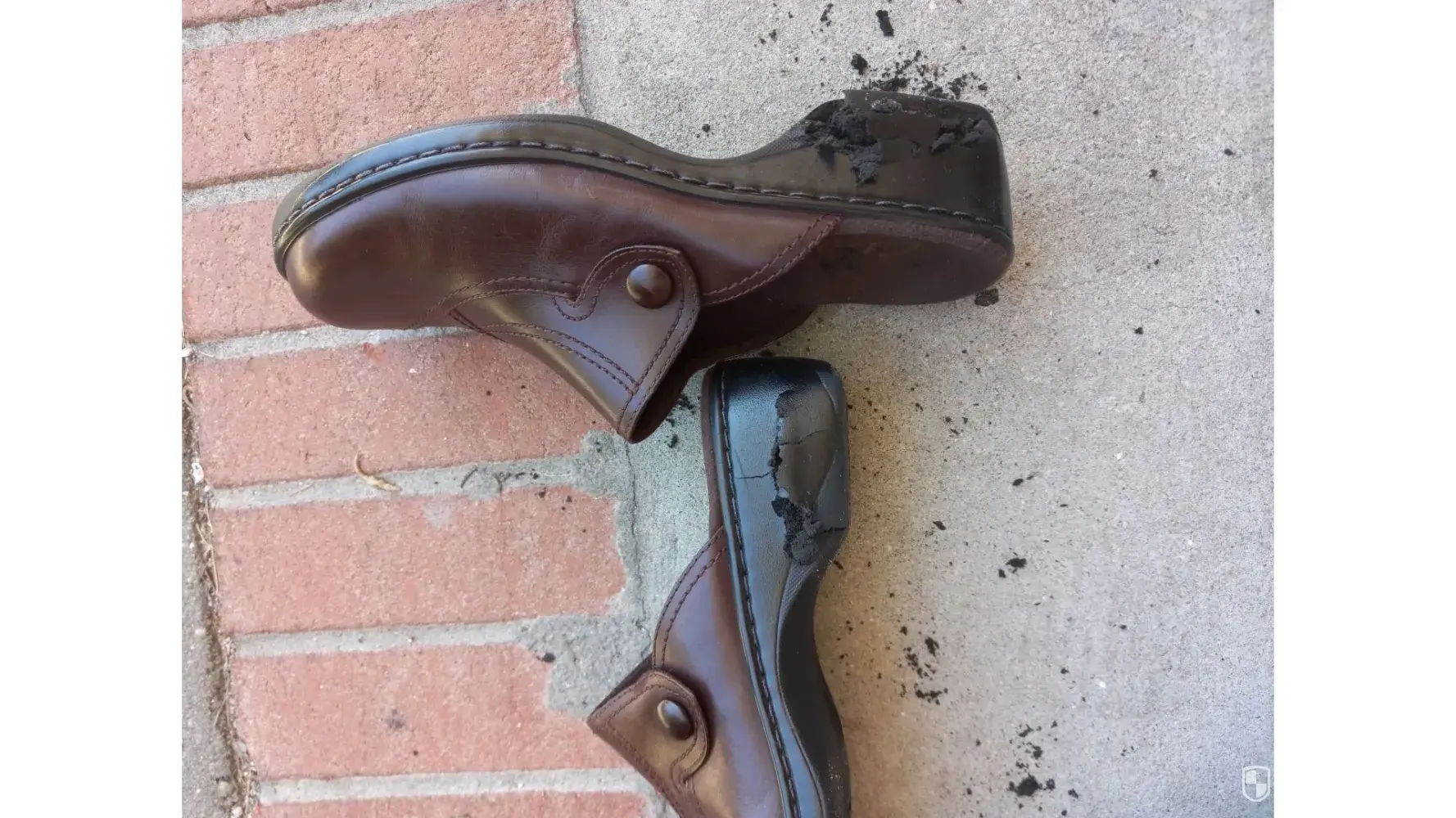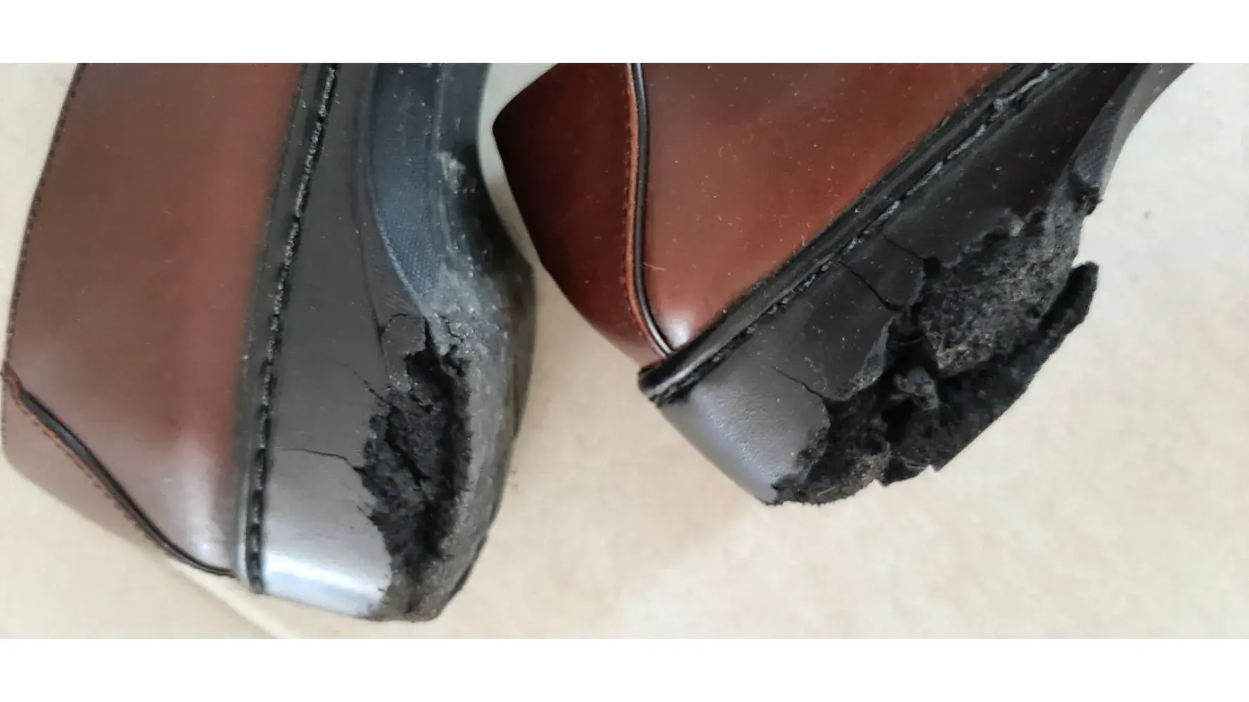 My wife and I were out having dinner with family when we noticed a bunch of black chunks of stuff on the floor under her chair at the restaurant. It turns out the soles of her shoes were disintegrating. She had to walk back to the car without her shoes because they were falling apart.