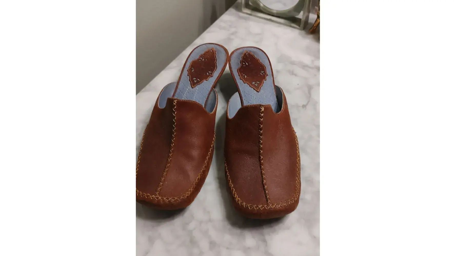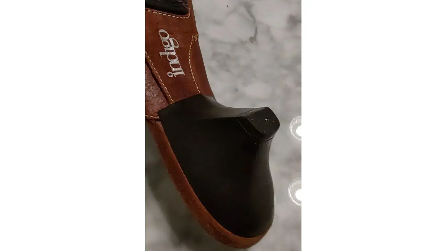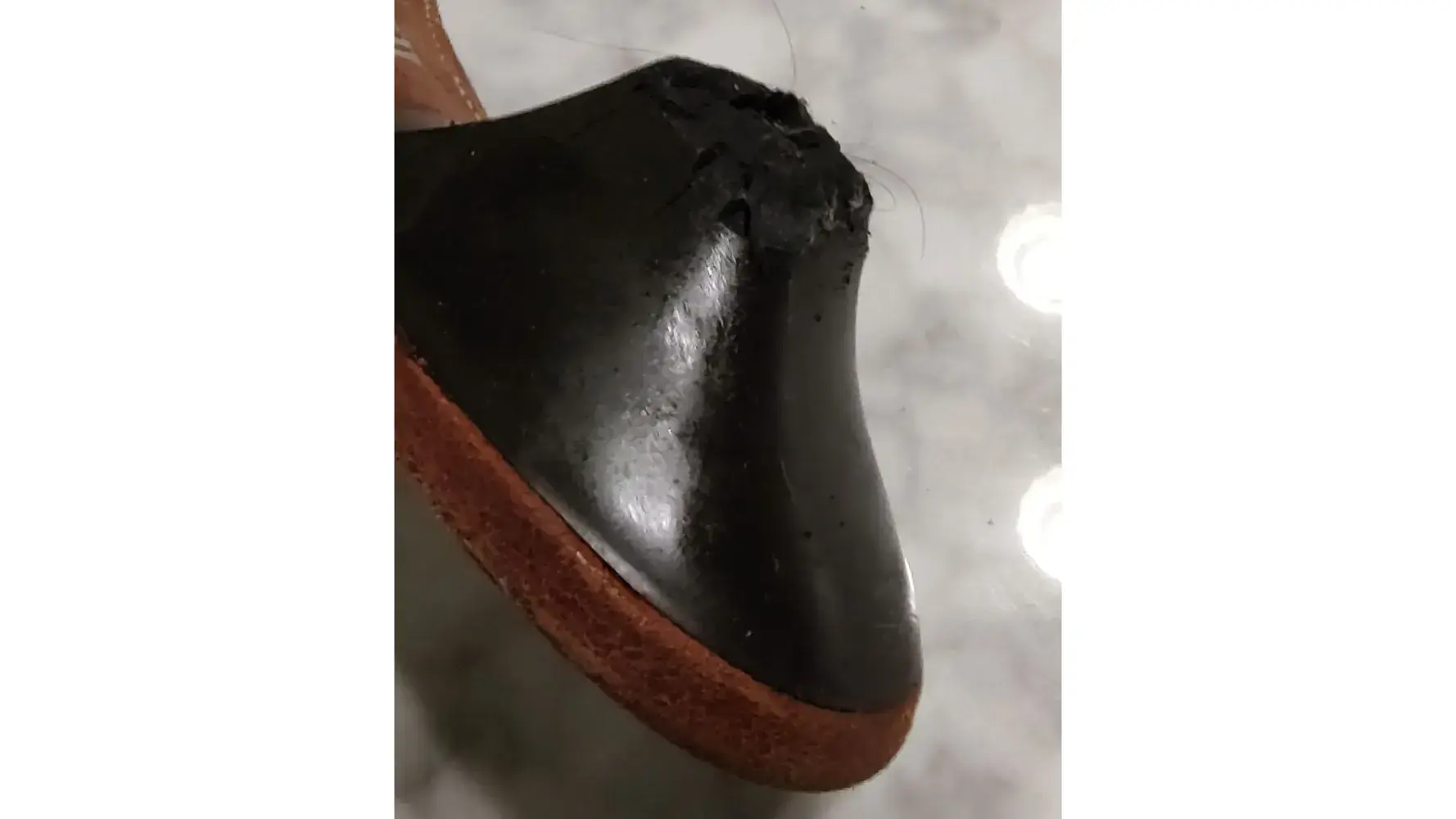 I have a beautiful pair of Clarks Indigo slides with kitten heels. I've only worn them a few times. I bought them because I thought they had a classic style and the shoes would last for years. Unfortunately, the last time I put them on, the heel on the left shoe cracked and broke off. The heel material is also sticky to the touch. The first photo shows the beautiful shoes. The second photo shows the cracked heel. The third photo shows what the heel should look like.