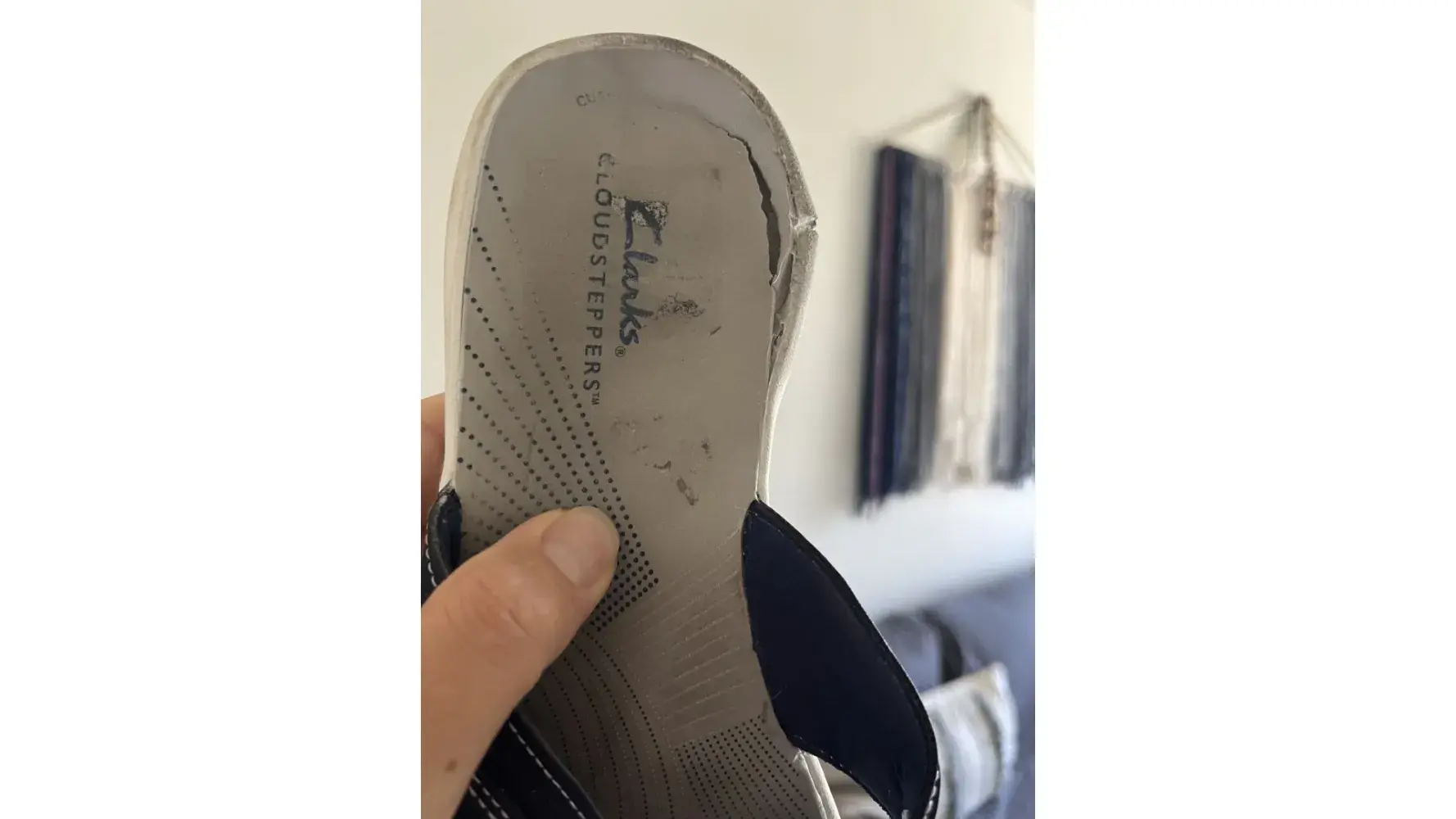 I was wearing my Clark’s today I did t walk far at all. Drive to the airport nothing strange. Got to a friends house to let the dogs out and walked in the yard. Thought I stepped in a hole but no. My shoes wearing disintegrating. The soles were like dirt clots. I had only walked in them for maybe 15 minutes total. Had to drive home barefooted. I am soooo disappointed.