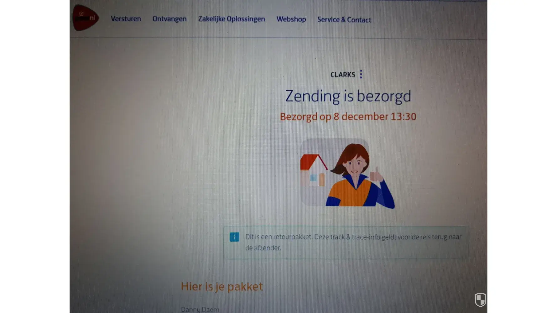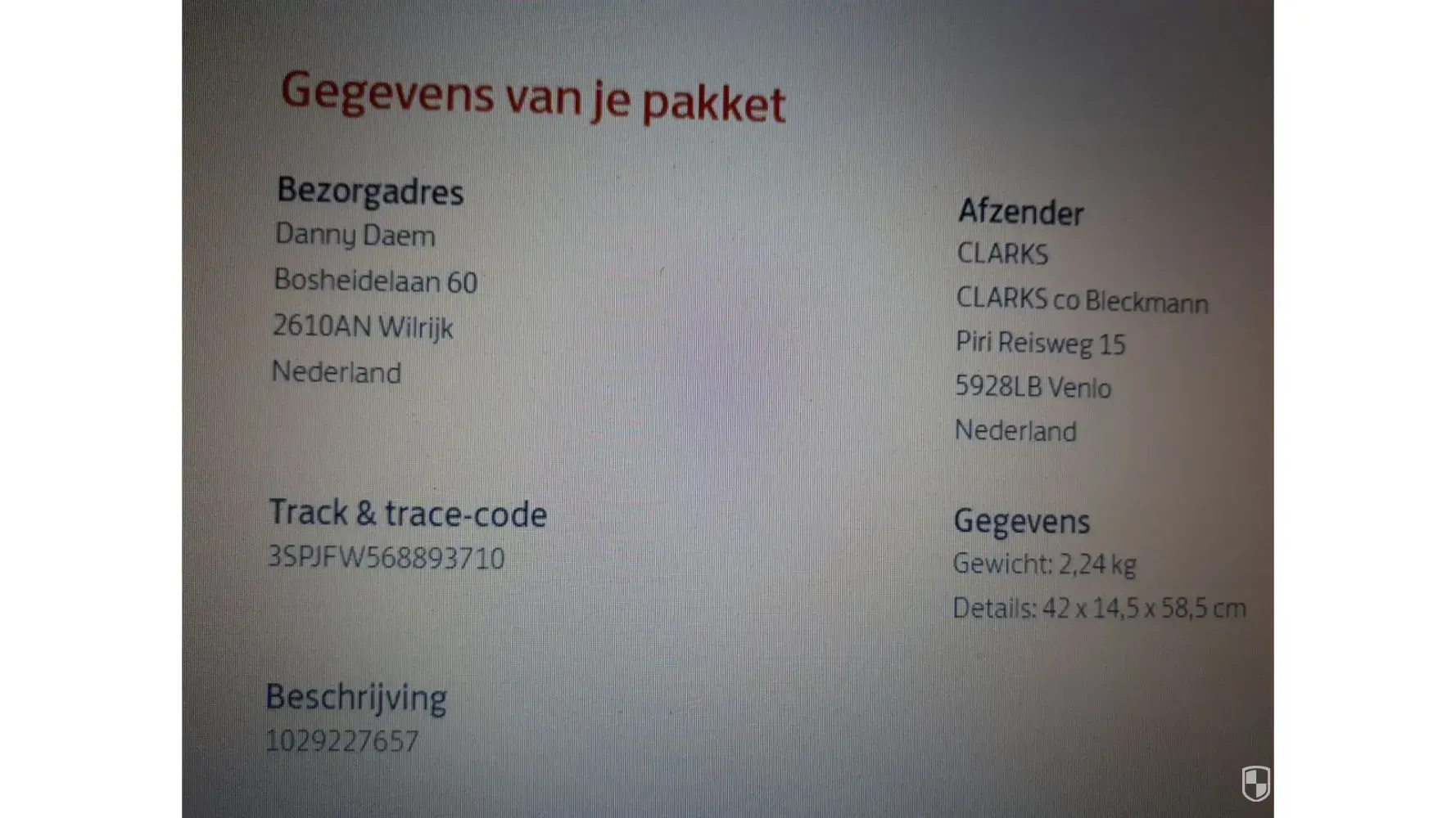 On the 8th of December at 13.30 hours I received a message from PostNL delivery service track and trace reference 3SPJFW568893710 and description [protected] with the indication that the delivery adres was wrong, and indeed it was.