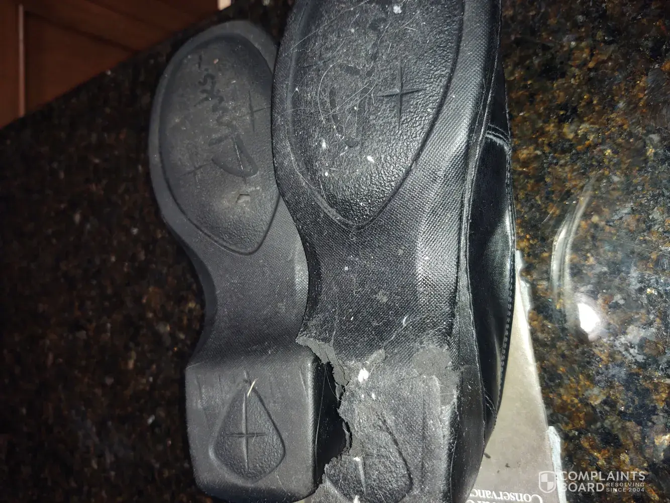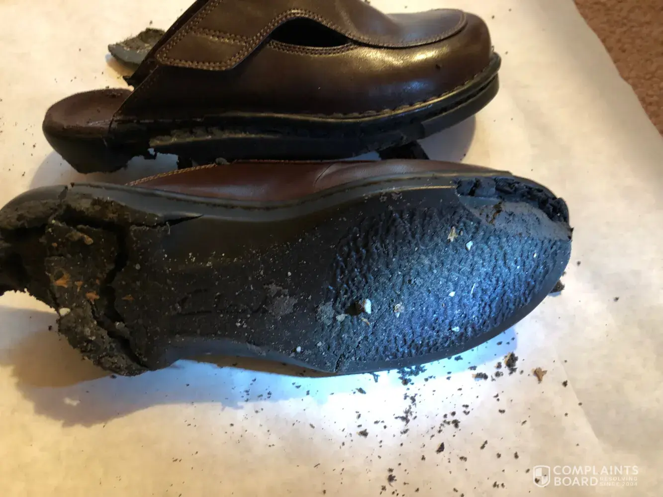 I am a handicapped 36 year old woman. I put on my Clark's Artisan shoes this morning to drive to work. I noticed my shoes did not feel right but thought it might be my weight gain. When I got out of the car I noticed a large chunk of black "dirt" by the brake which turned out to be from my shoes. When I looked down at my soles and I found out that my shoes were torn up and full of holes and large crevasses. I could have fallen very easily and shudder to think of injuries!