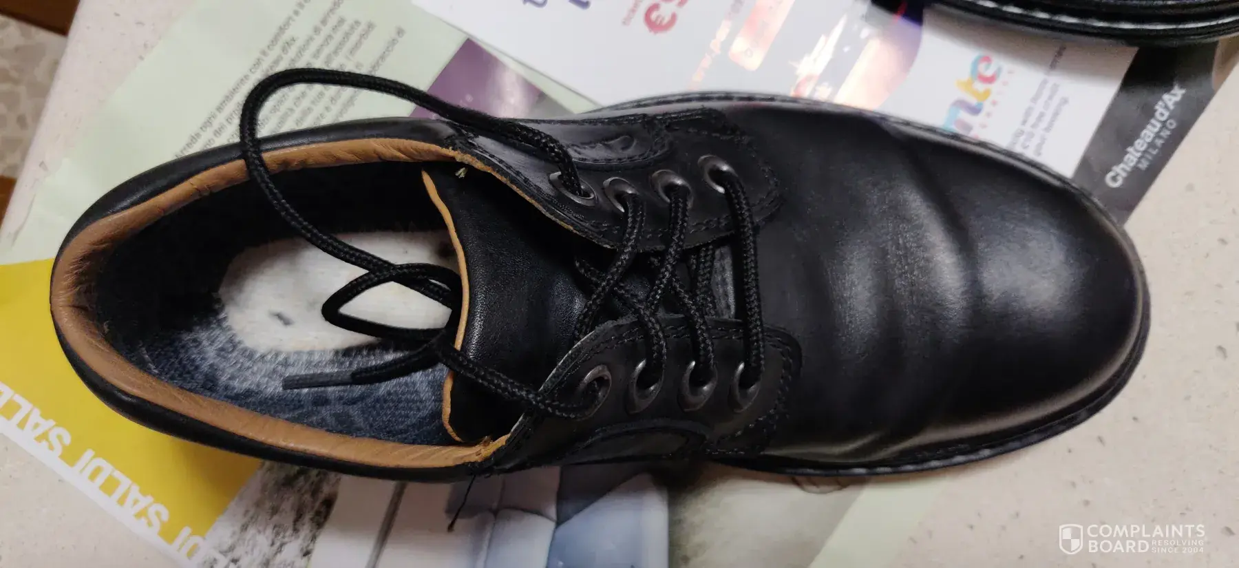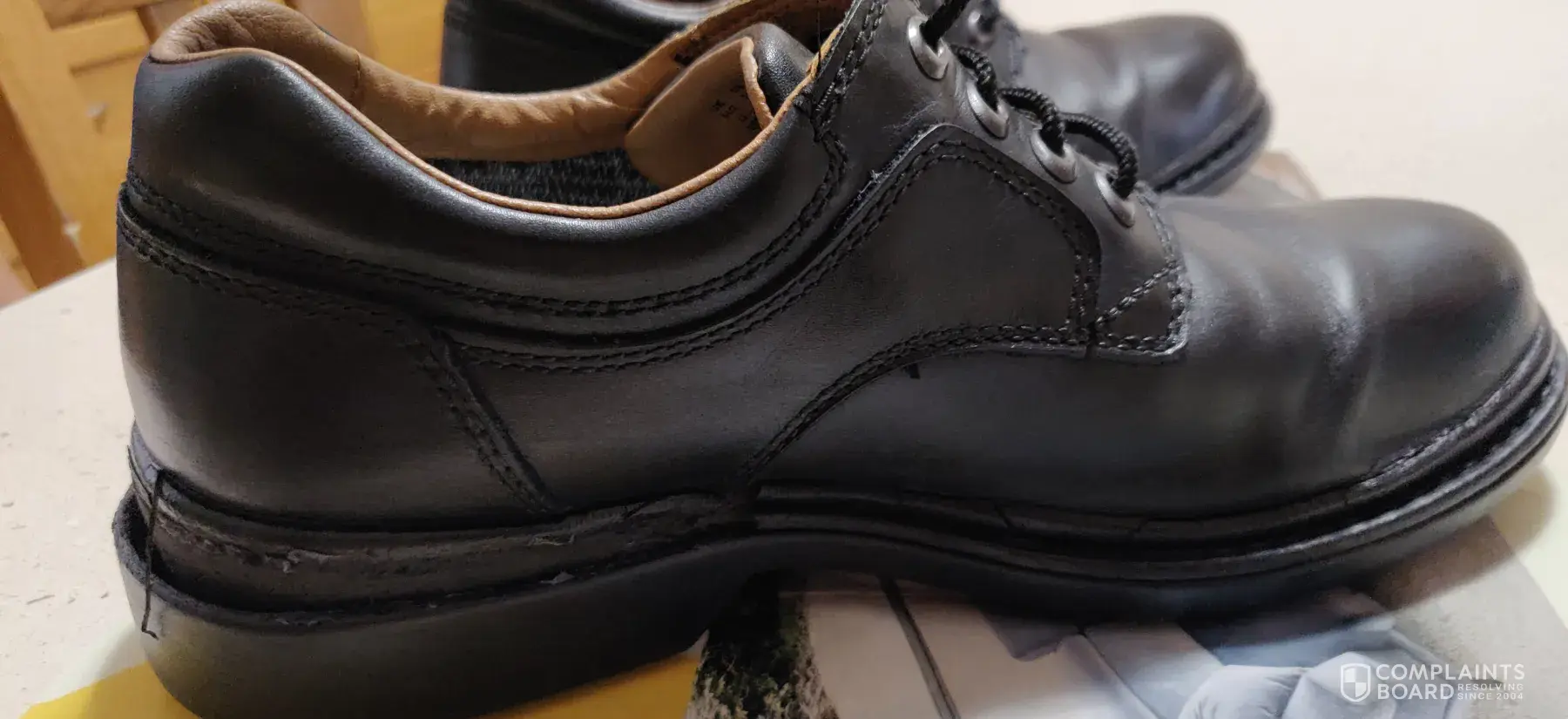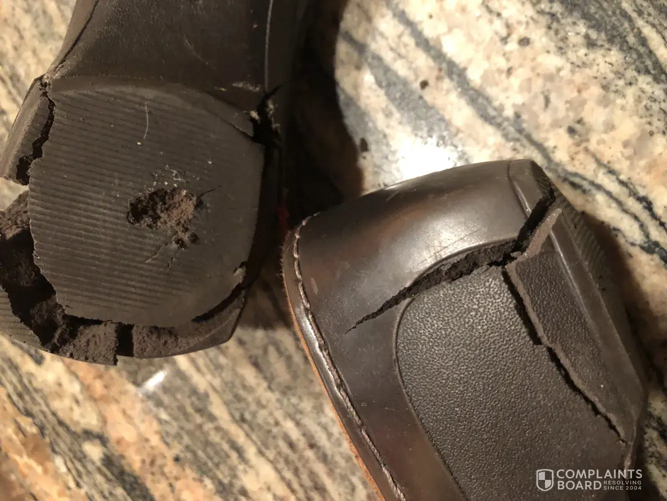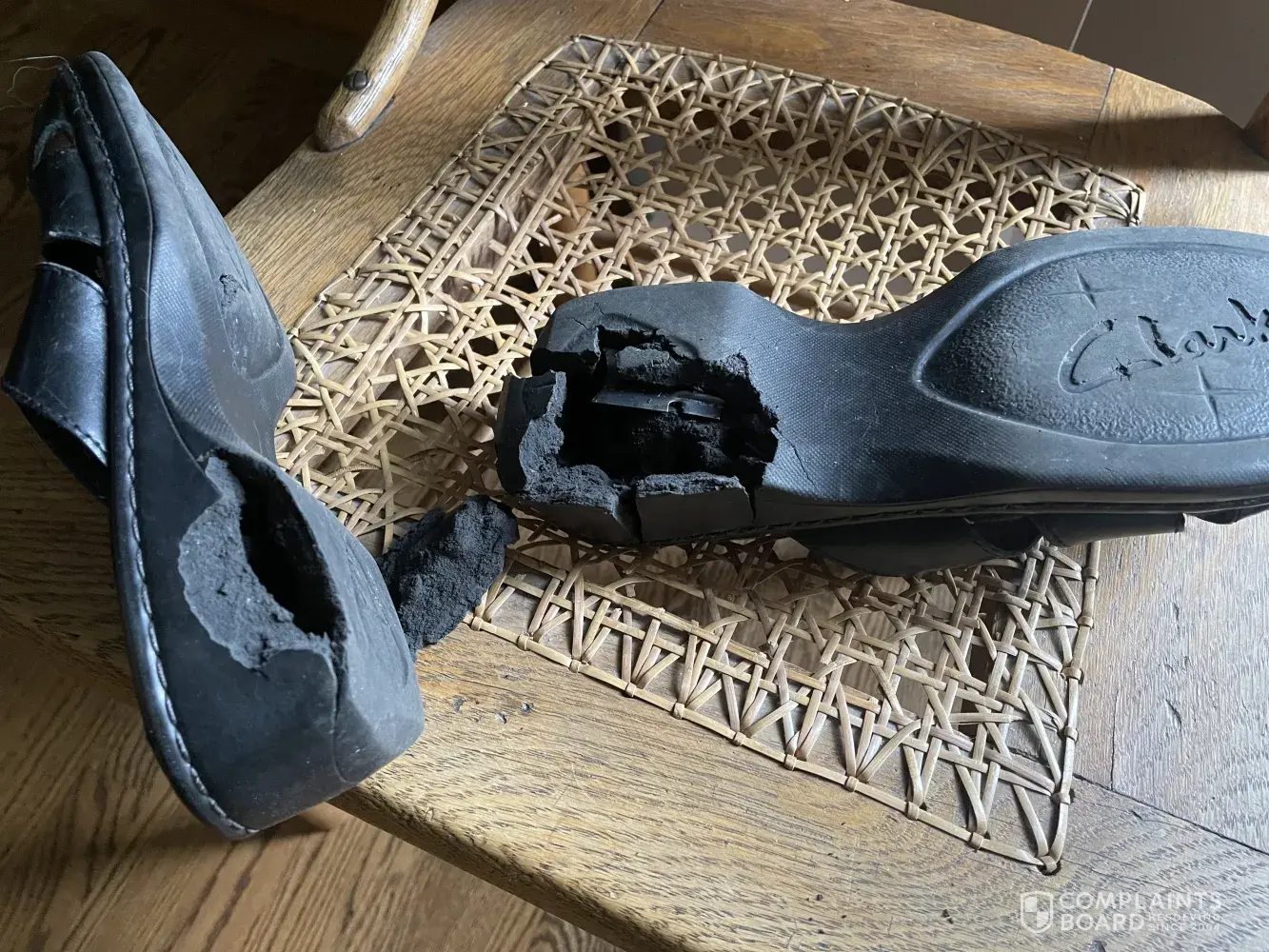 I bought a pair of Clarks shoes.They were brand new and looked perfect.I put my right foot in the right shoe.Then I turned to watch the tv for about 5 minutes. Then I went to put on the left and saw the shoe on my right foot had completely fallen apart.I couldn't believe it, bits of rubber on the floor, uppers split open, sole broken into cracked pieces and also, a lot of dust and debris was inside the shoe and it looked like there were areas of wear inside the toe section.