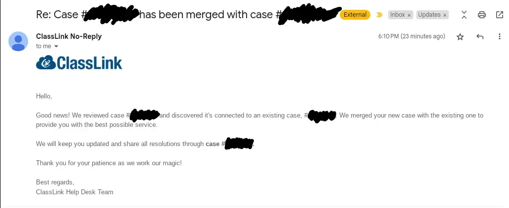 Also, on May 17, 2025, somewhere near 10 PM (PST), ClassLink merged my case to the case from April 2025 (not sure if this is true). But before 10 PM at that time, I requested it again a few hours before 9 PM with the mention of the complaint here. There was no response after merging it