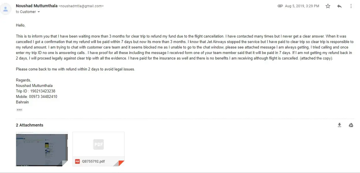 I have booked ticket for myself and family from Bahrain to Kozhikode from cleartrip on 13th Feb 2019 including Travel Guard policy. We got the confirmed Jet Airways ticket for 19th June 2019. Cleartrip cancelled my ticket on 18th April 2019 due to Jet Airways suspended all flights, and cleartrip agent confirmed that I will get my refund within 7 working days. I have been waiting more than 7 months for clear trip to refund my amount. I have contacted many times but I never get a clear answer. I know that Jet Airways stopped the service but I have paid to clear trip so clear trip is responsible to refund the amount. I am trying to chat with customer care team and it seems blocked me as I am unable to go to the chat window, I tried calling and once enter my trip ID no one is answering calls.. I have proof for all these including the message I received form one of your team member said that it will be paid in 7 days. I spoke to some of cleratrip customer service team but no use, they will ask me to wait for more days . I have paid for the insurance as well and there is no benefits.