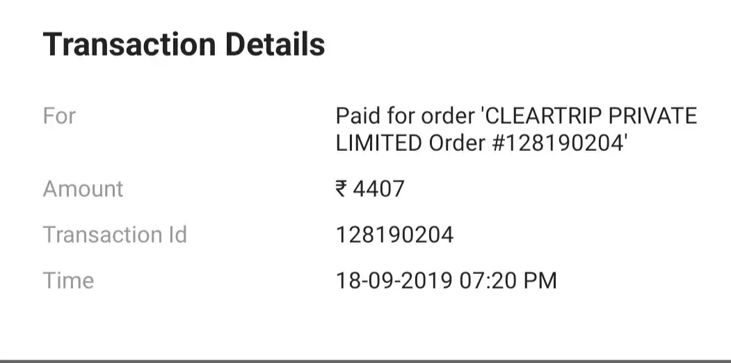 I was booking ticket from Ranchi to Bangaloreon Cleartrip app on 18sep 2019 at 7.20 pm. my money 4407 rupees deducted from Paytm wallet but ticket not booked...paytm transaction I'd is [protected]...Cleartrip order I'd is128190204..I am attaching screen shot with this complain.There is no customer care no where I can call directly.. please help me in this problem...