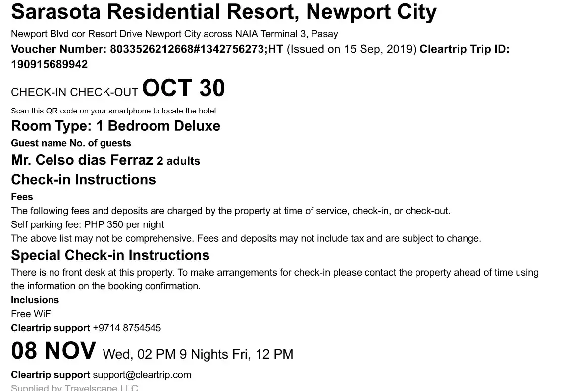 I buy 9 nights at Sarasota Residential Resort in Manila, Philippines. IN SEP 15/2019.