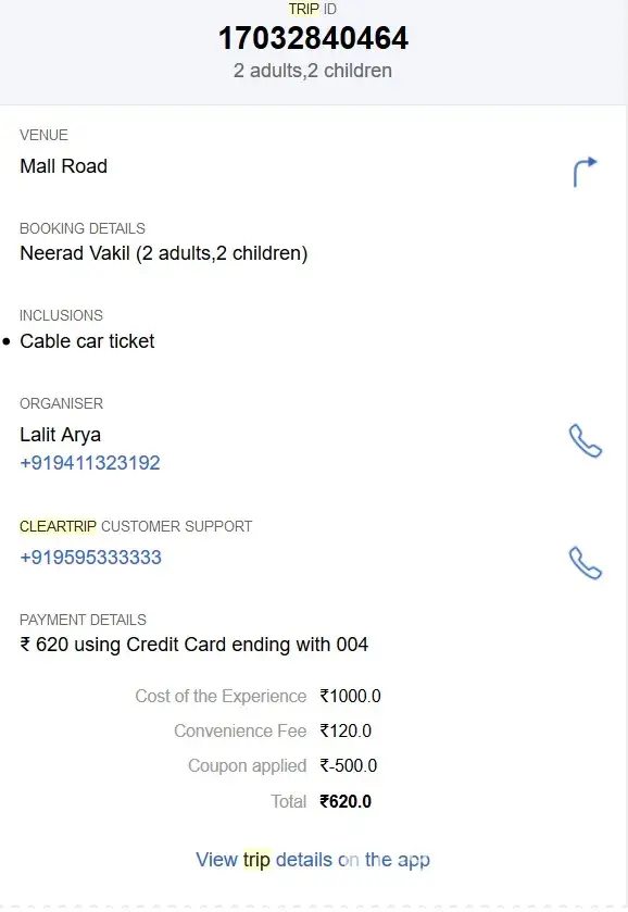 So I book 7 tickets from cleartrip.com for Nainital Cable car ride. The booking was for 1 May 2017 at 10am. There was not clear information how we will get the entry to the cable car. So I called the cleartrip call center and asked how should I proceed with this booking and she told me that go to the counter and show the email. This email is your ticket.