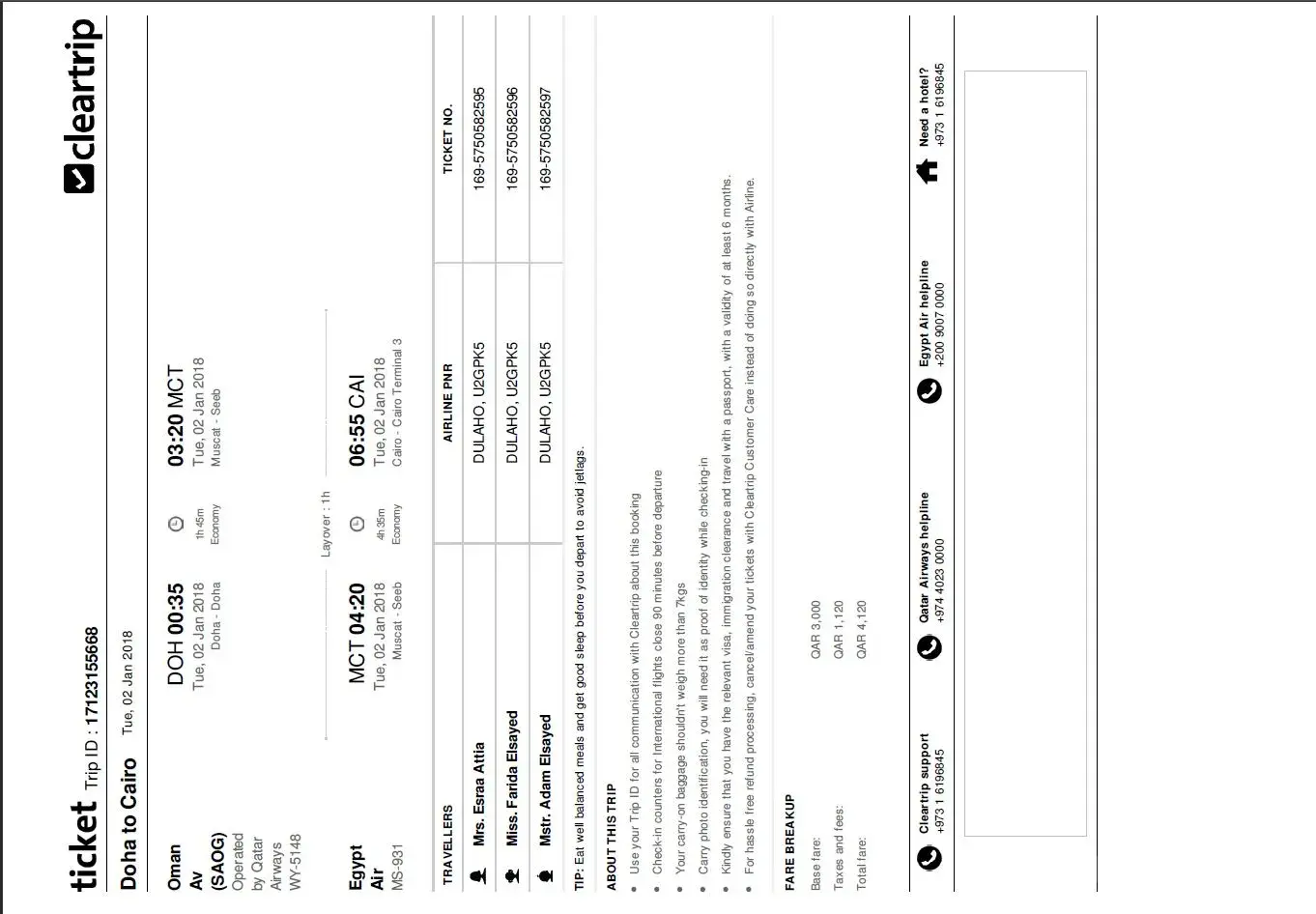 I book a ticket from Cleartrip website at 31dec2017 for a ticket from Doha to Cairo, on 2jan2018 early morning.