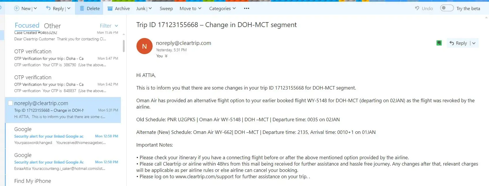 Now I received an email from your agency that trip from Doha to Muscat is changed and become 9:30 pm in 1st Jan 2018. I went to Hamad International Airport at the time and check the Oman airlines but there is no reservation under my name. So I call Qatar airways they inform me that Oman airway cancels the trip and put me on 2 Jan 2018 at 9:30 am. Based on the above my trip to Egypt on 2Jan2018 at 4:30 from Muscat will fail to catch it,