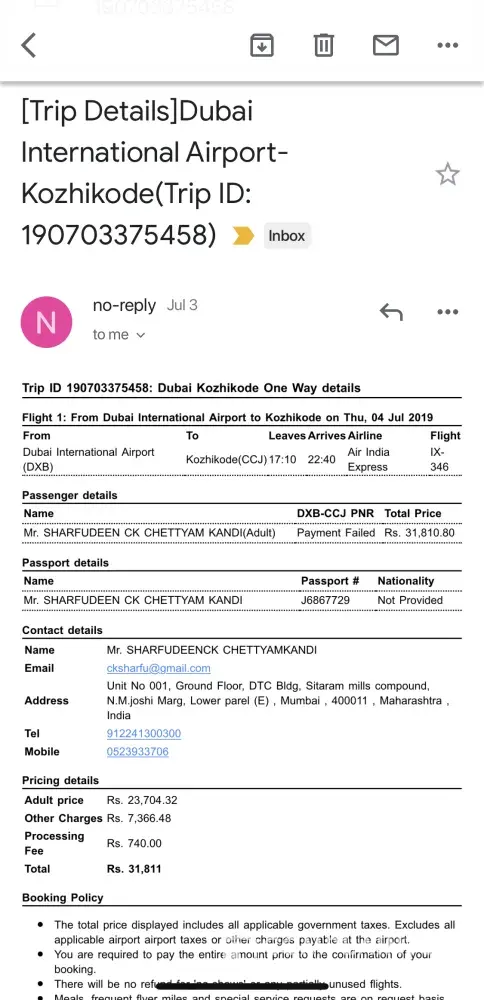 10-02-2020, booked through credit card. Credit card holder - tom gerric mathew...Booked person email id - shigin@nls.Ae. Sender mobile phone - [protected].
