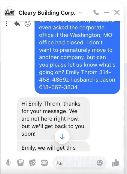 My name is Joey Loftsgard, and I am a Region Manager for Cleary Building Corp. I personally made contact w/the client immediately Friday morning once the complaint came across my desk. The delays in the start of his building were communicated to Mr. Biffar. I gave Mr. Biffar a timeframe of the Cleary crew being on site, which was at the end of the week. I then tried contacting Mr. Biffar on Monday morning as promised, did not reach him, but left a voicemail confirming the crew would be on site at week’s end, once they completed their current project on the schedule. I made contact with Mr. Biffar via phone on Tuesday to again confirm the game plan. Since then, myself and the local Branch Manager have been in daily contact with Mr. Biffar on the status of the crew being on site. Myself and the Branch Manager will be on site once this building starts, and throughout the process to completion. We will do everything in our power to exceed his expectations moving forward with this project.