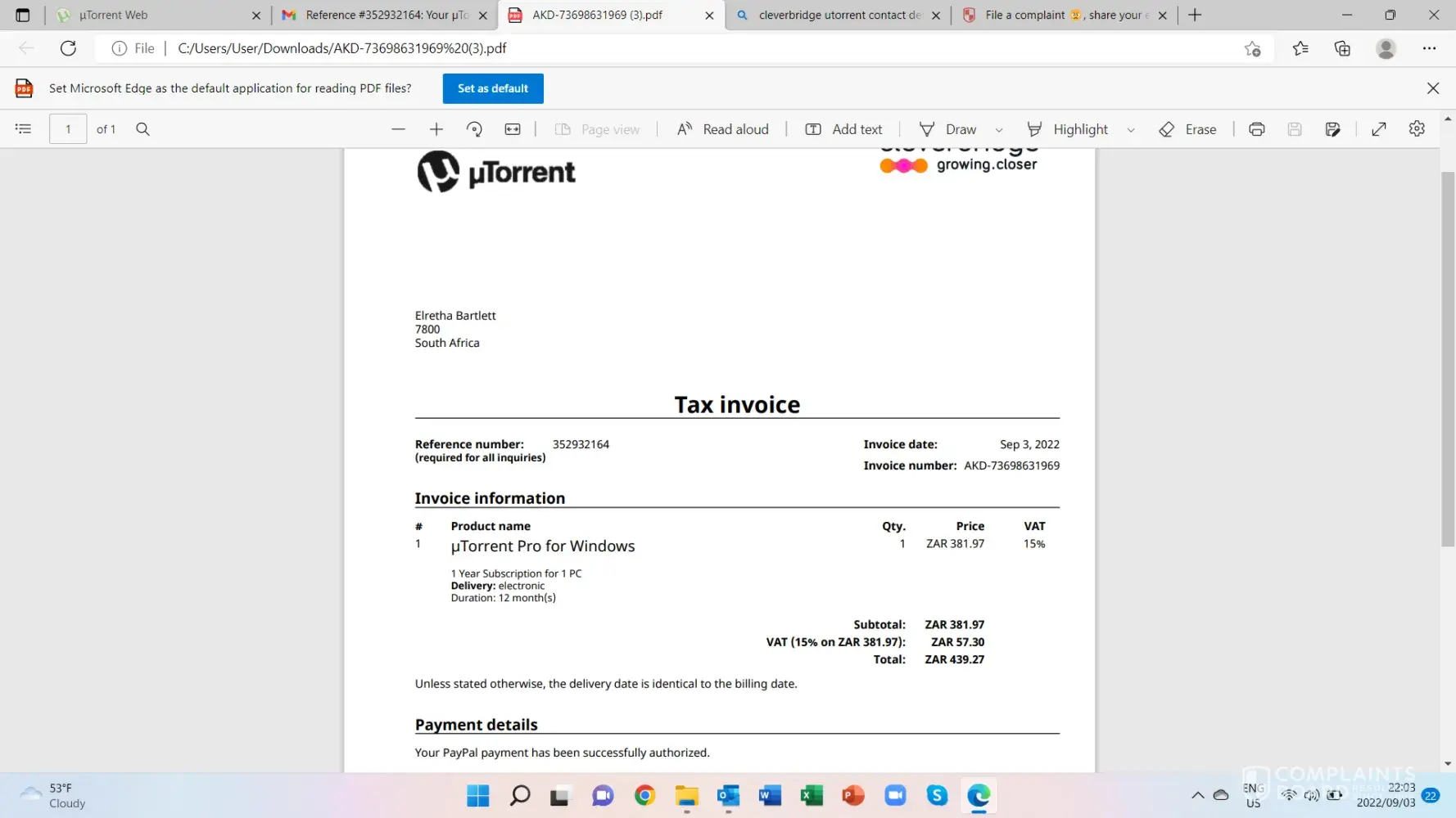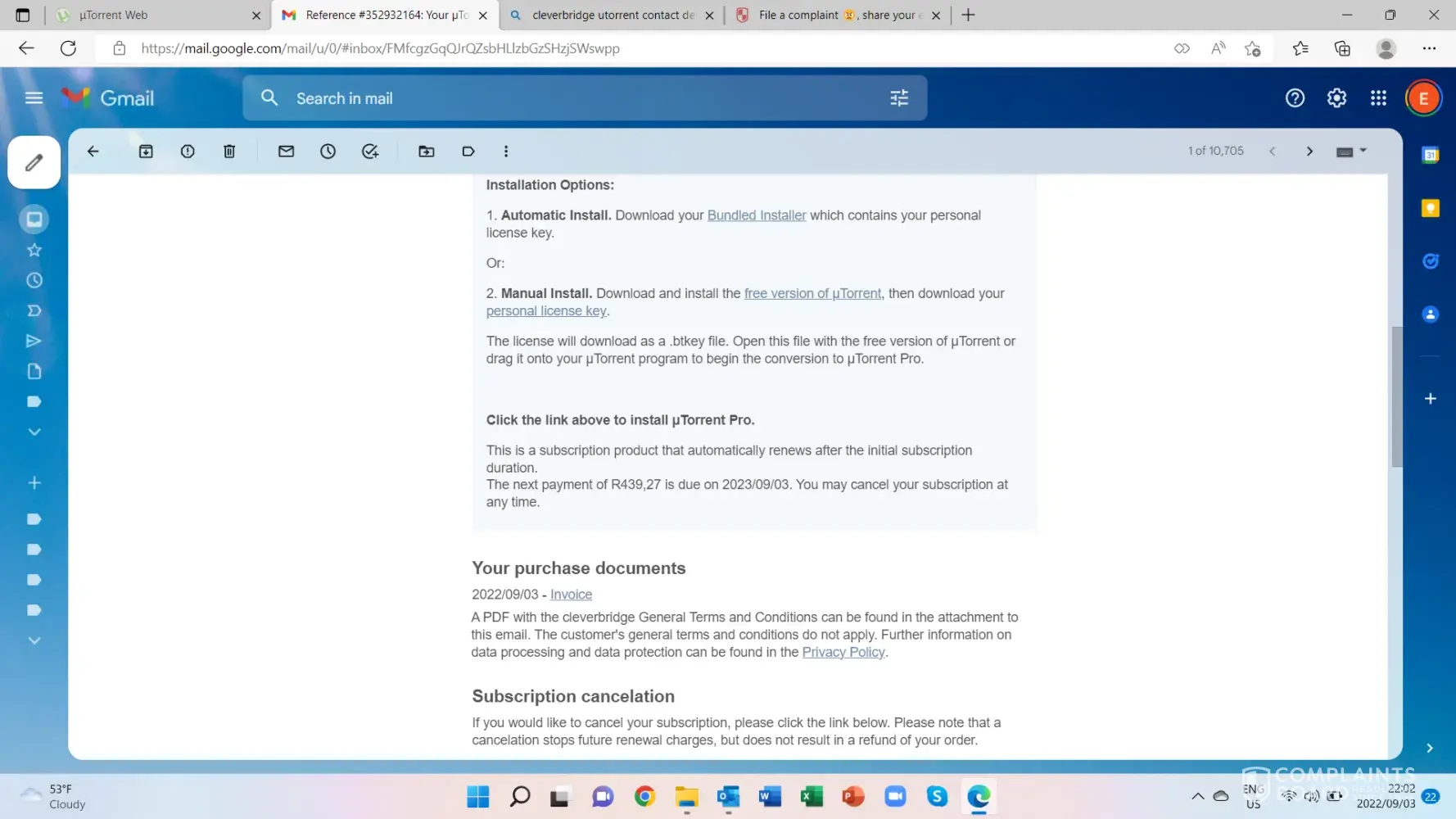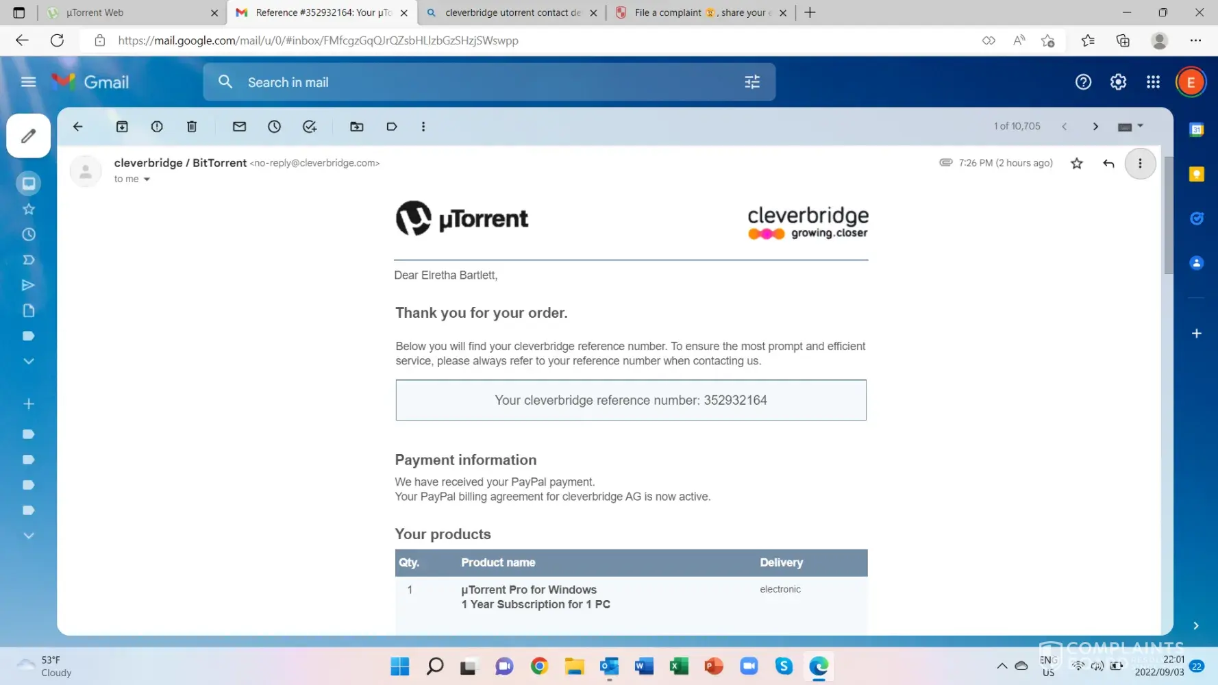 Referennumber: [protected]. Clerverbridge email 2022-11-13 At 14.58