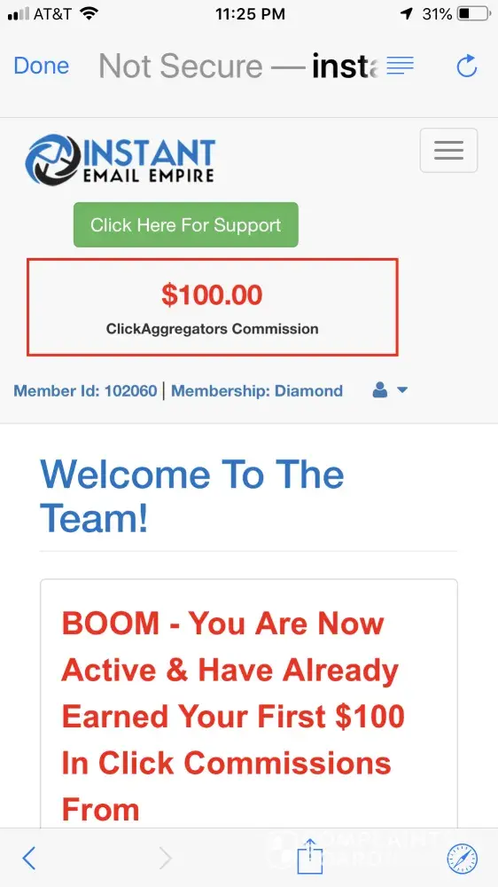 5 minutes ago I was duped into paying $34 via credit card for this scam with Clickaggregators.com & Instant Email Empire. They showed me a screenshot of $100 in my new affiliate account which I was guaranteed in exchange for paying $34 for a 90-day free trial of their pay-per-click email system. However, upon logging in I noticed several red flags as to this being a scam so I did not proceed in clicking anything further as I did not wish to be involved with this site. I immediately researched online & found out this is indeed a scam and nobody has ever received a payment from this company despite what the screenshot may show as commission dollars in my account. In addition, people are told after having paid to join, that in order to cash out you need $1, 000 minimum. So that $100 in my account is a phantom payment. Please refund my $34. My name is Lisa Pearlman and I can be emailed at [protected]@gmail.com.