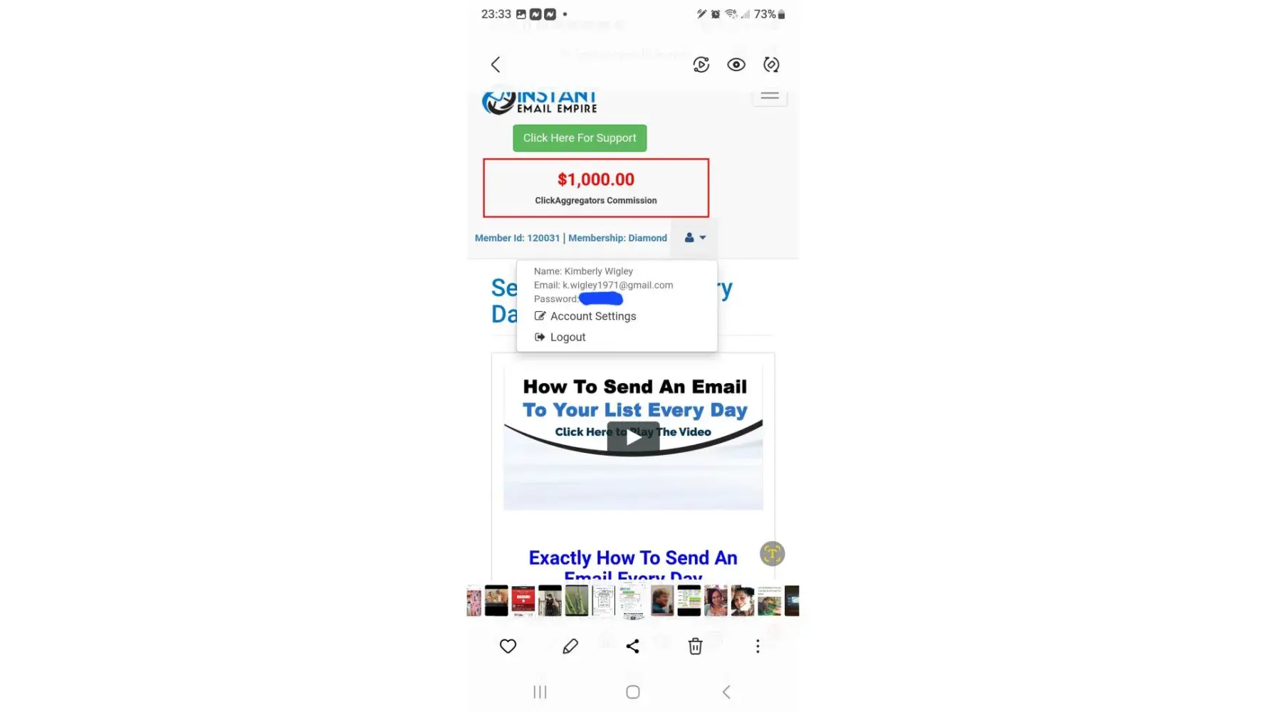 I hit the $1000.00 mark and all of a sudden they had me email wrong so I couldn't get my payout. Very frustrating because I paid every month... This shows my account info and the fact that I reached the $1000.00 mark. I just found my picture as I forgot about this program thinking it was a scam.