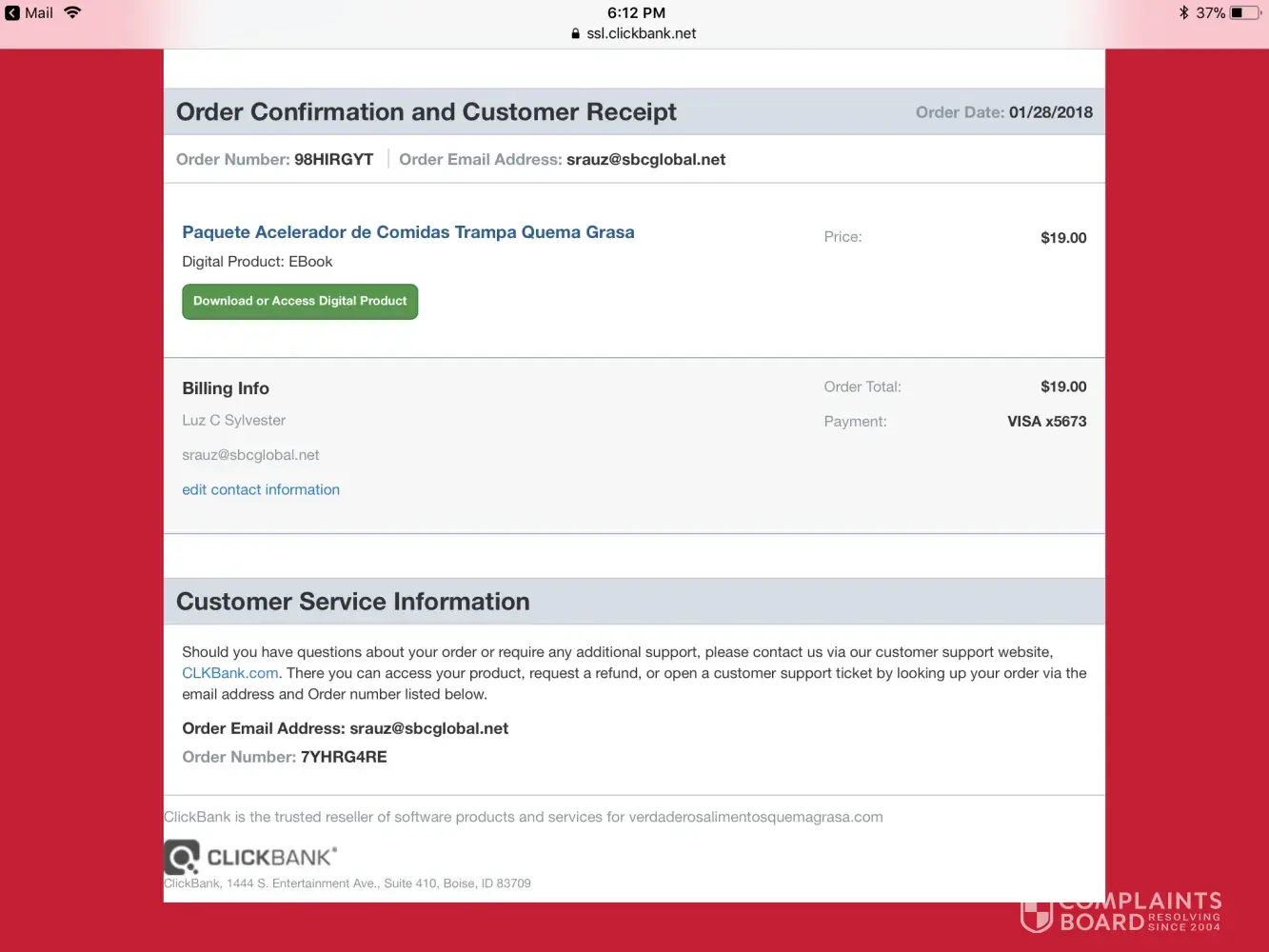 I live in Australia, was visiting in Canada and having trouble with my feet. I purchased an eBook for the treatment of Plantar Fasciitis- paid for it with my credit card and the eBook was sent to my email address.I am having trouble with my BIGPOND email and I never received it. The transaction on my credit card statement is as follows: CLKBANK*COM_JZQ24YET [protected] ON FRGN AMT: 54.13 Canadian Dollar.